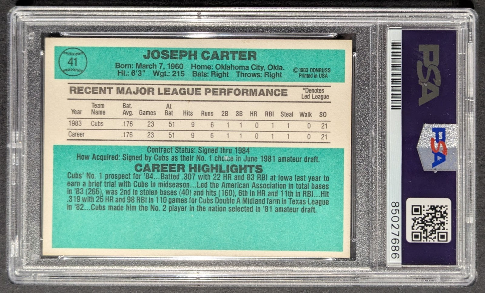 - 1983 Donruss Joe Carter Rated Rookie Chicago Cubs MLB Signed Trading Card
