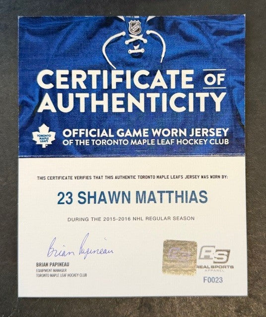 - 2015-2016 Toronto Maple Leafs Shawn Matthias Game Used Jersey COA
