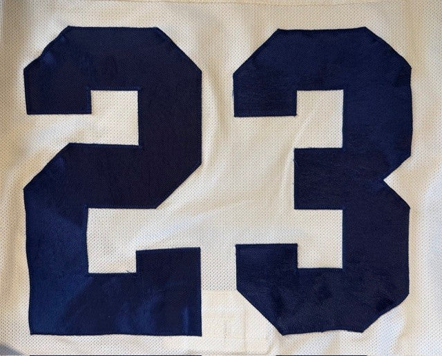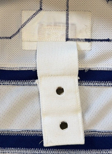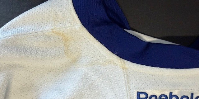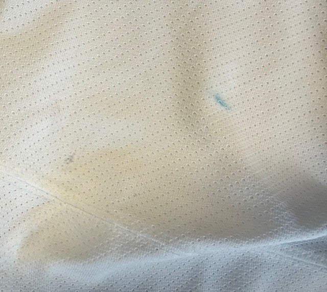 - Excellent condition; small blue transfer mark on left sleeve. Yellow discoloration from sweat on back neckline. Left sleeve has a team repair. Team tag with inventory number stitched inside matches the LOA