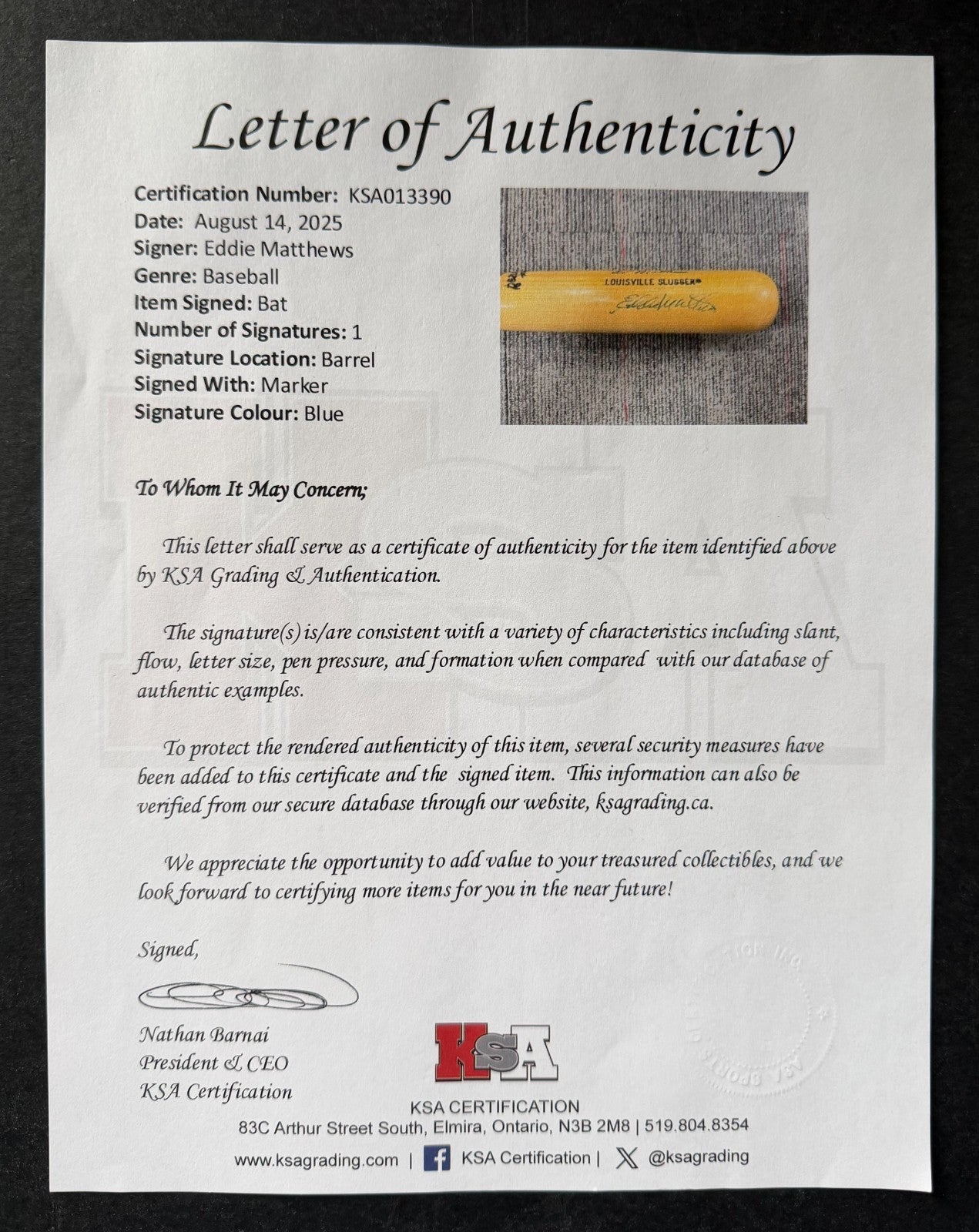 Eddie Mathews Signed Louisville Slugger Model Baseball Bat Hillerich Bradsby KSA