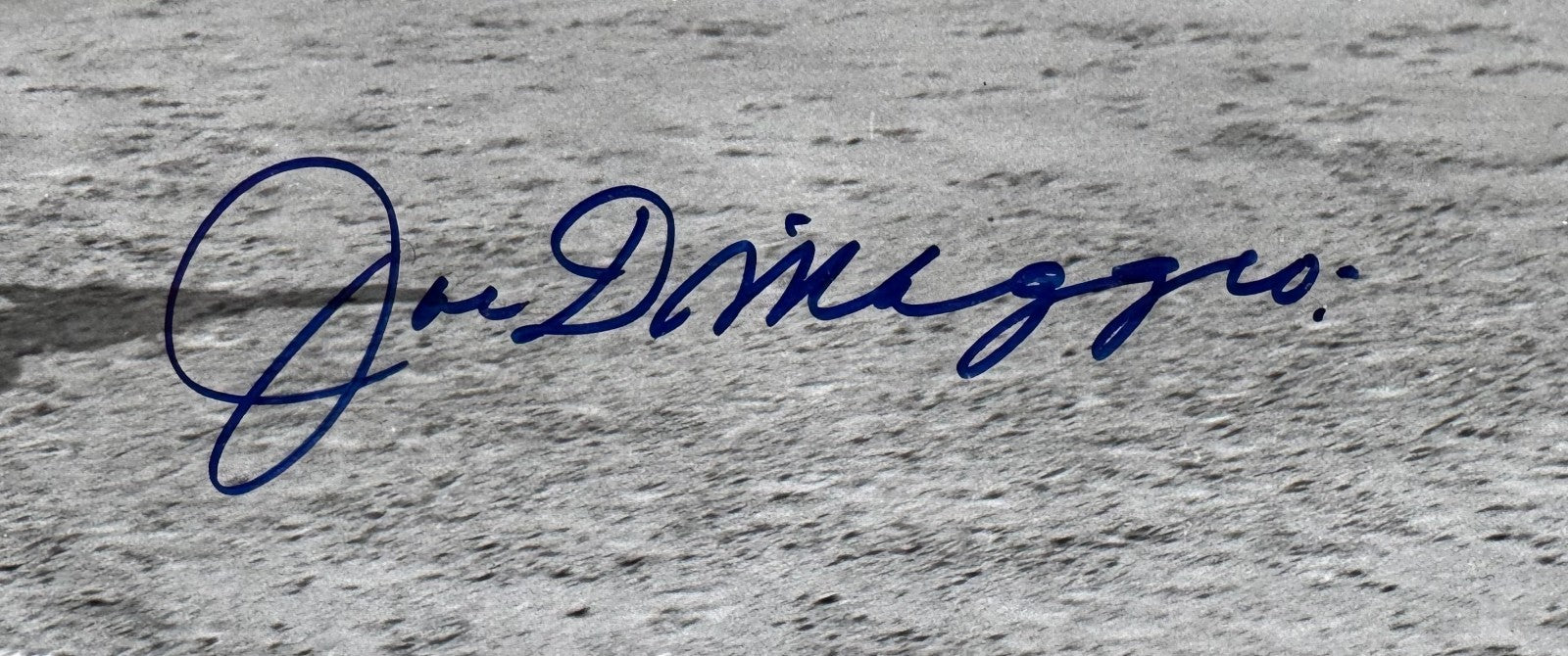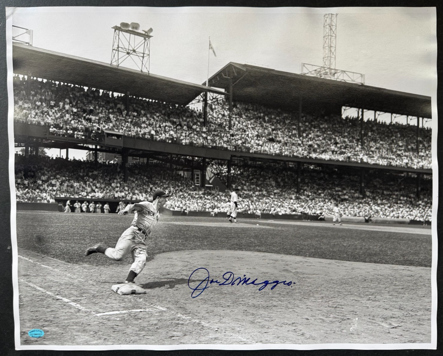 • Joe DiMaggio signed oversized photo of the Yankees HOFer rounding first base at Yankee Stadium, signed large and bold in blue marker