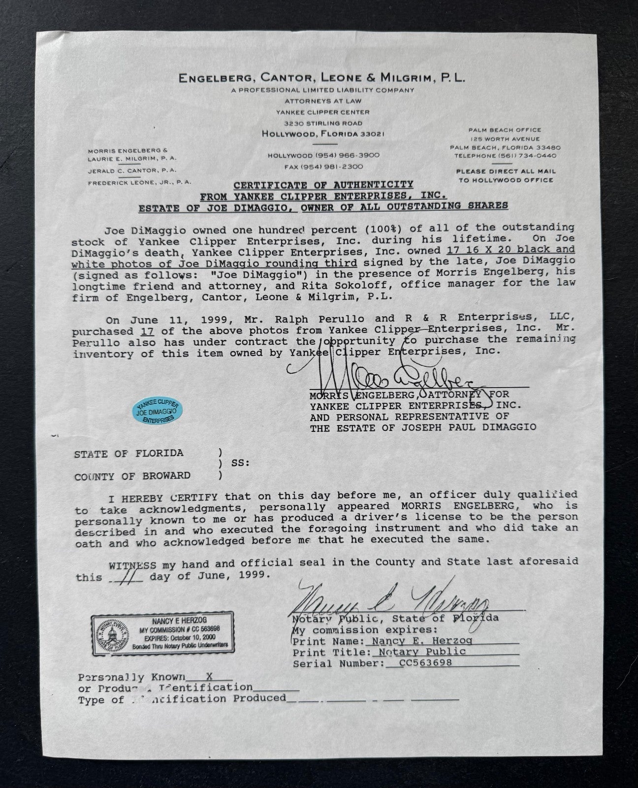 • LOA provided by Yankee Clipper Enterprises - DiMaggio's former company