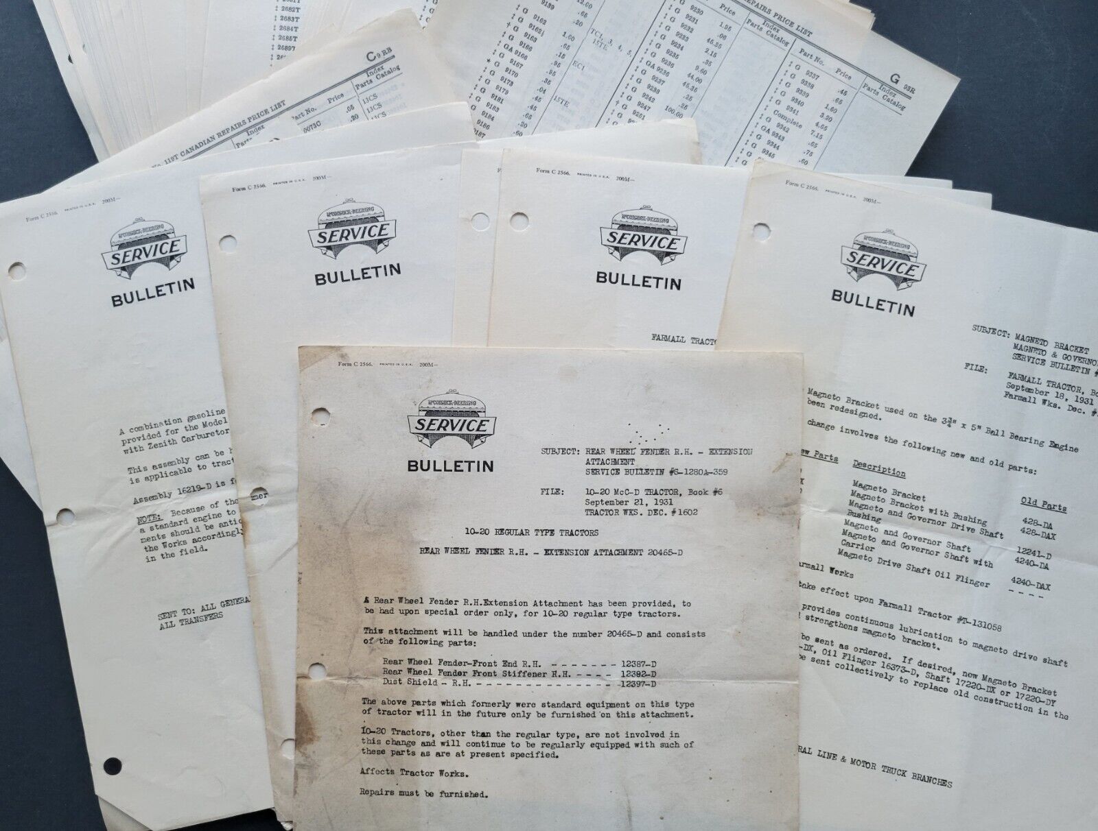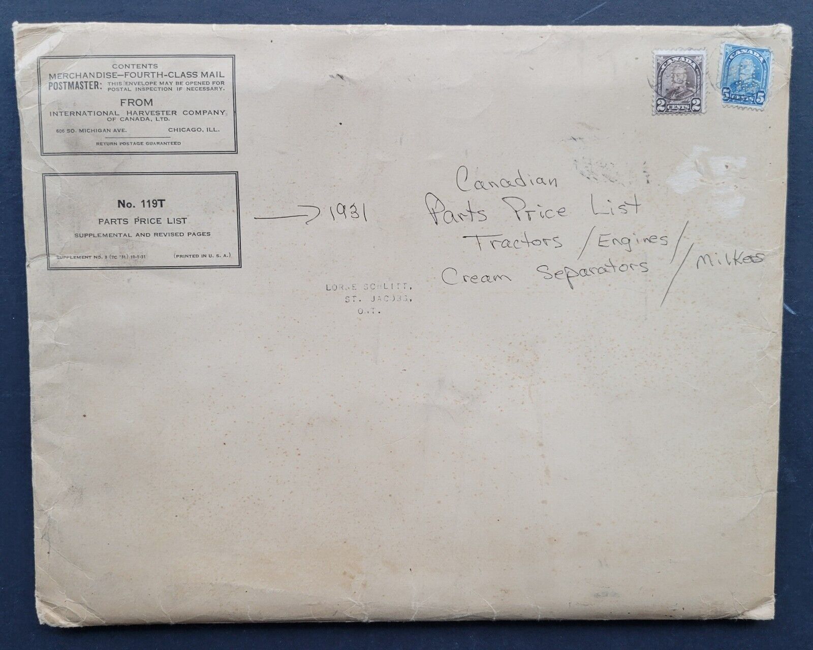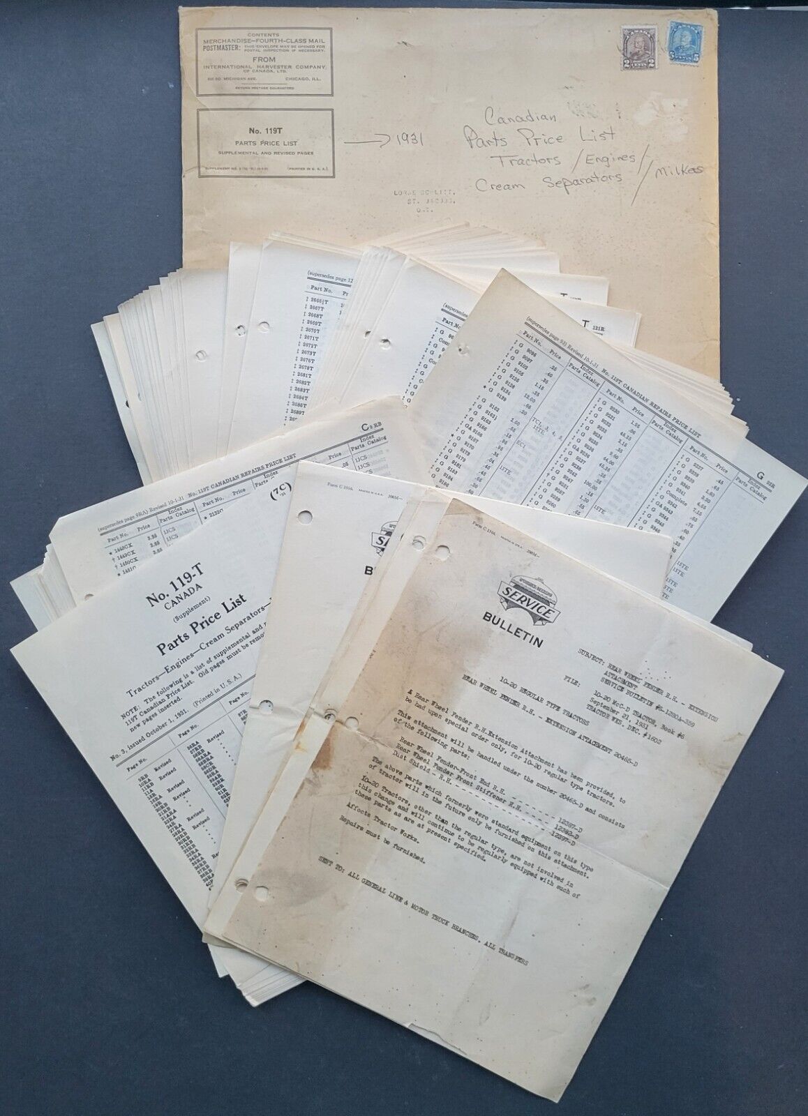 - 1931 International Harvester and McCormick-Deering Canadian parts price list + service bulletins for tractors, engines, milk separators and milkers with original envelope