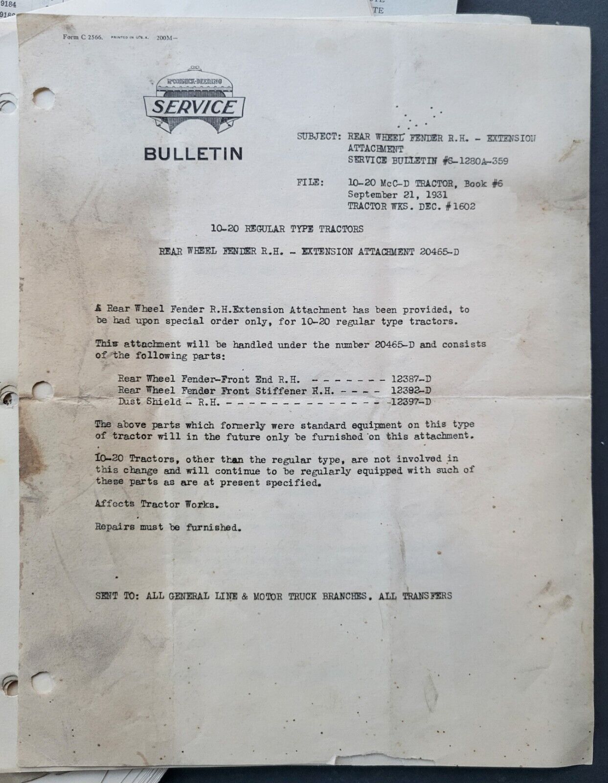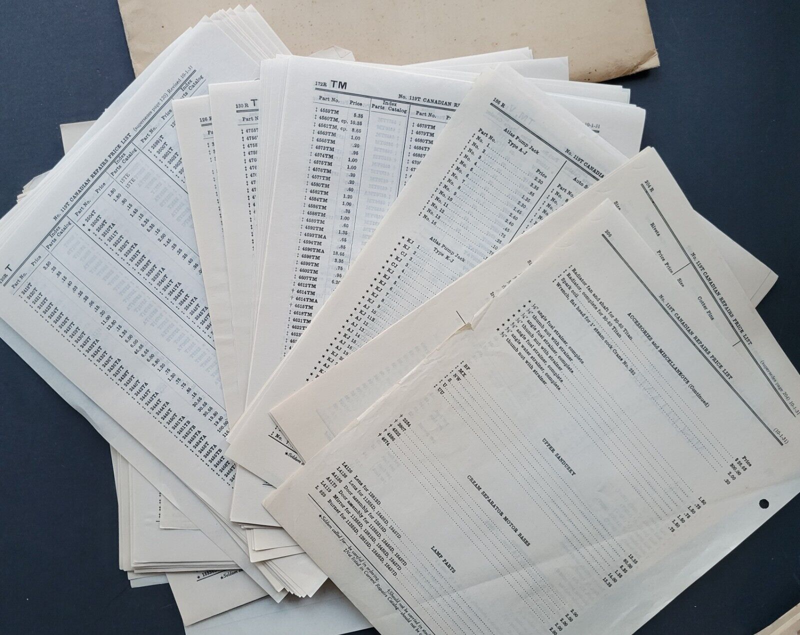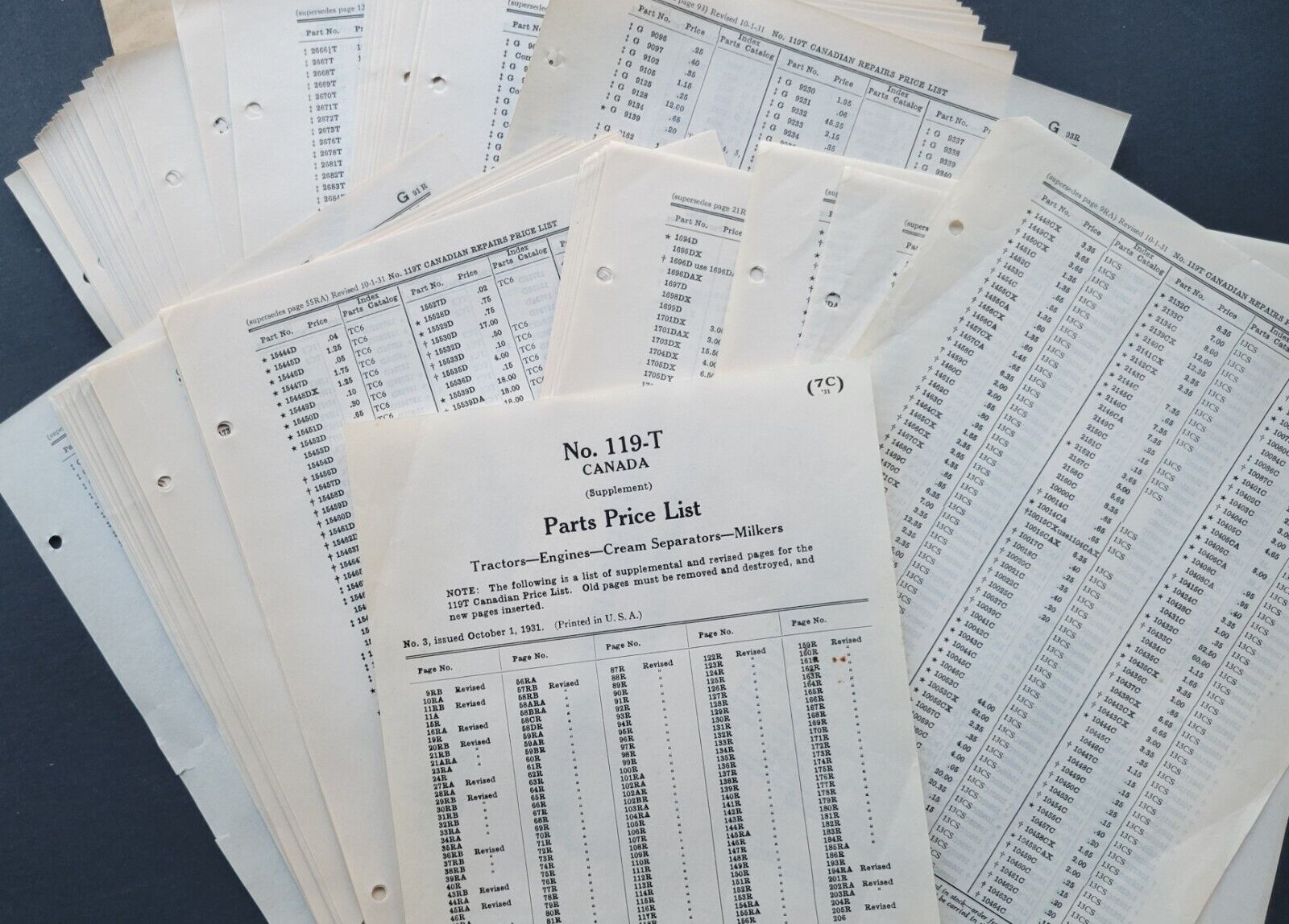 - 1931 International Harvester and McCormick-Deering Canadian parts price list + service bulletins for tractors, engines, milk separators and milkers with original envelope