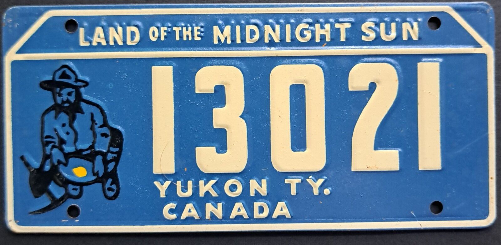 - Yukon metal license plate shows prospector panning for gold