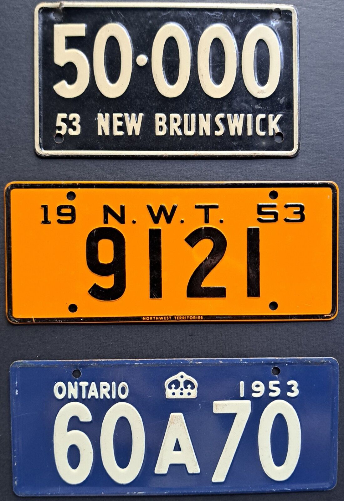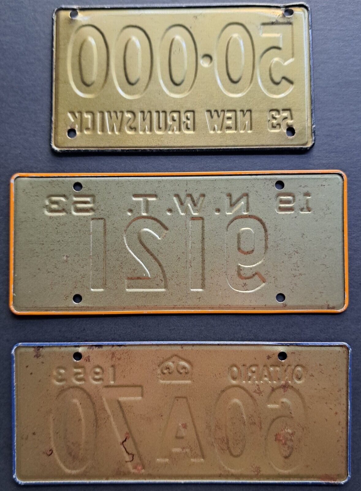 - 1953 Wheaties Cereal Premiums Canadian Provincial Metal License Plates Ontario + North West Territories + New Brunswick