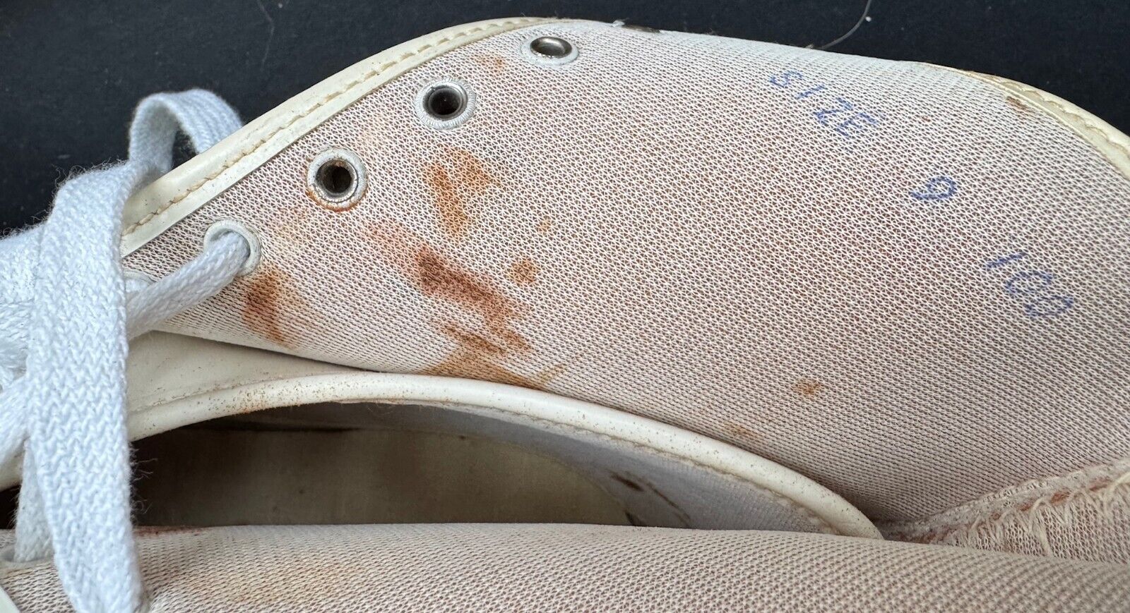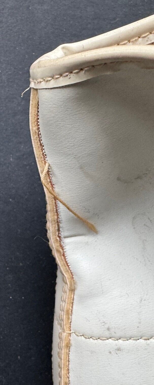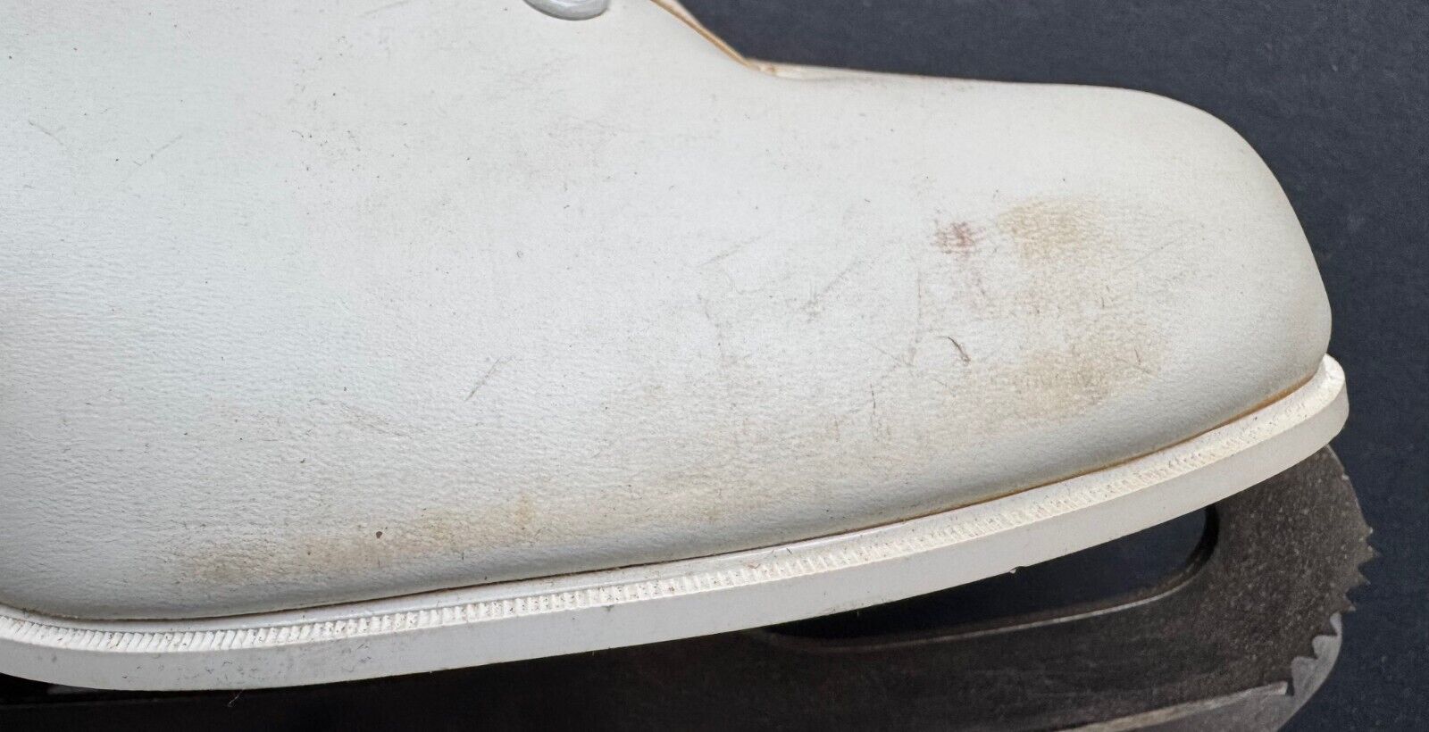 - Very good lightly used condition; some spots of discoloration on the inner ankle areas of both skates. Some light scuffs, marks and general usage wear on outside of skates. Some excess thread on the rear lining of each skate but there is no fraying