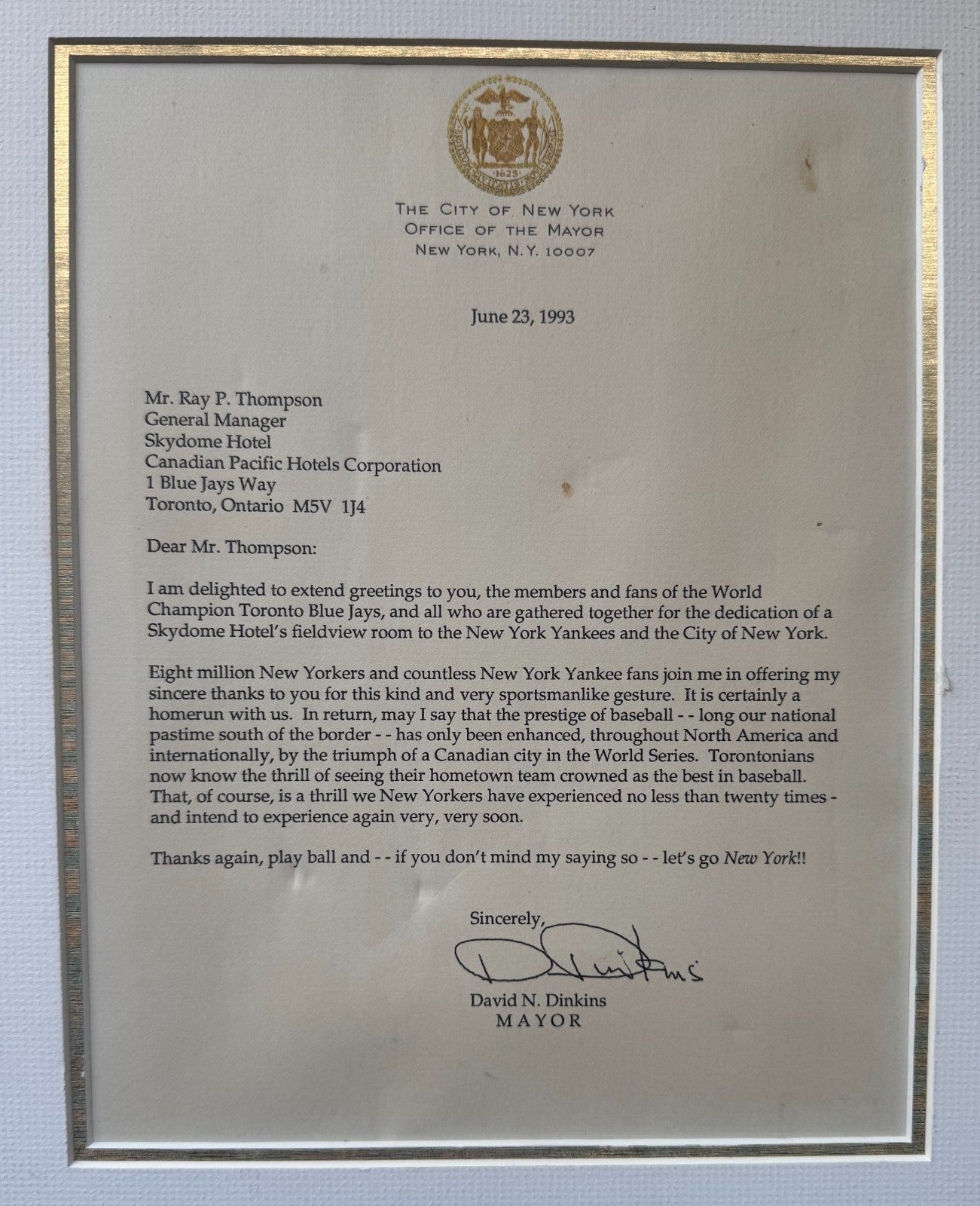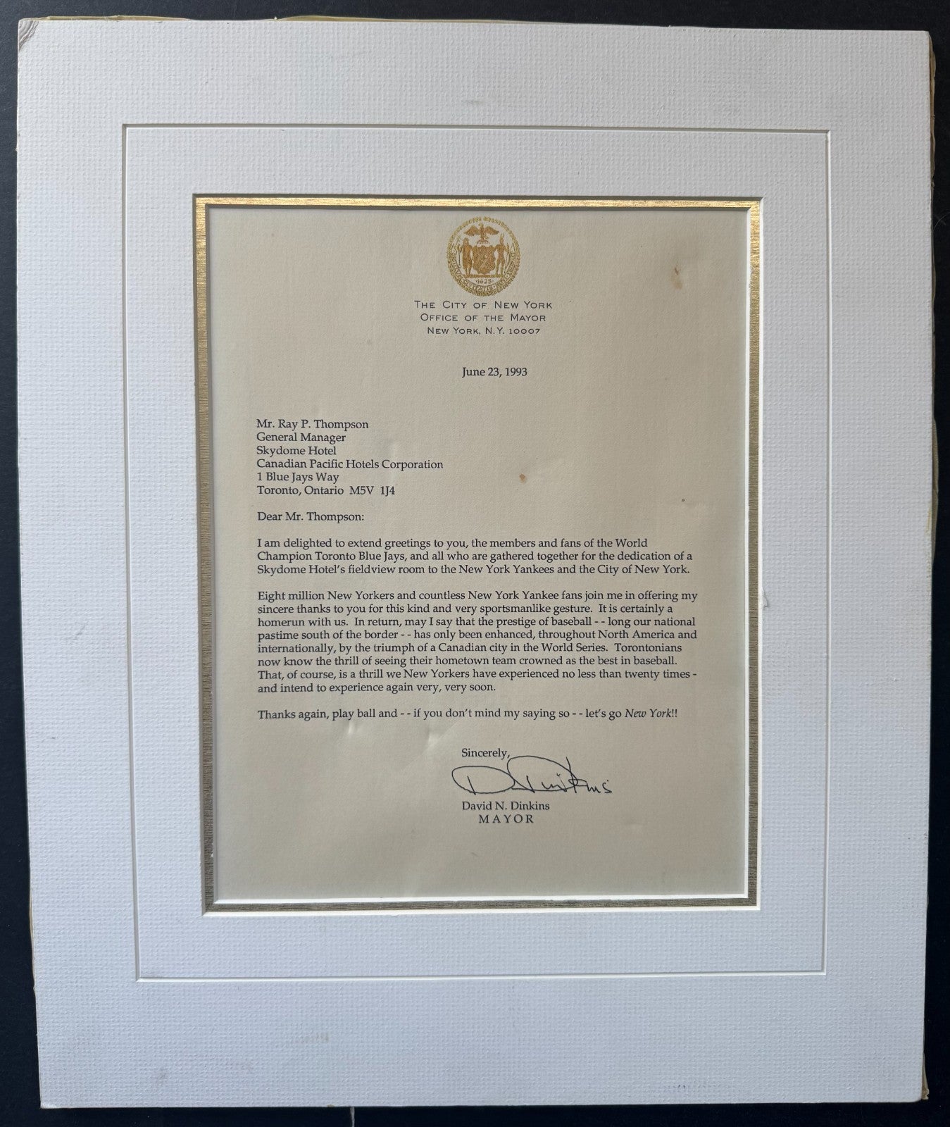 - Dinkins writes to the manager of Toronto's Skydome hotel recognizing the hotel for introducing a New York Yankees themed field view room