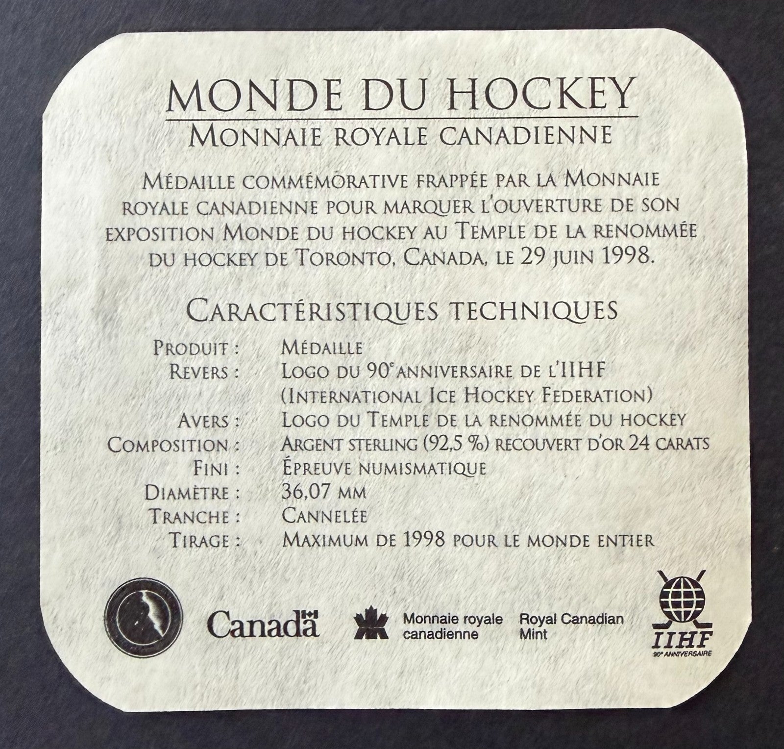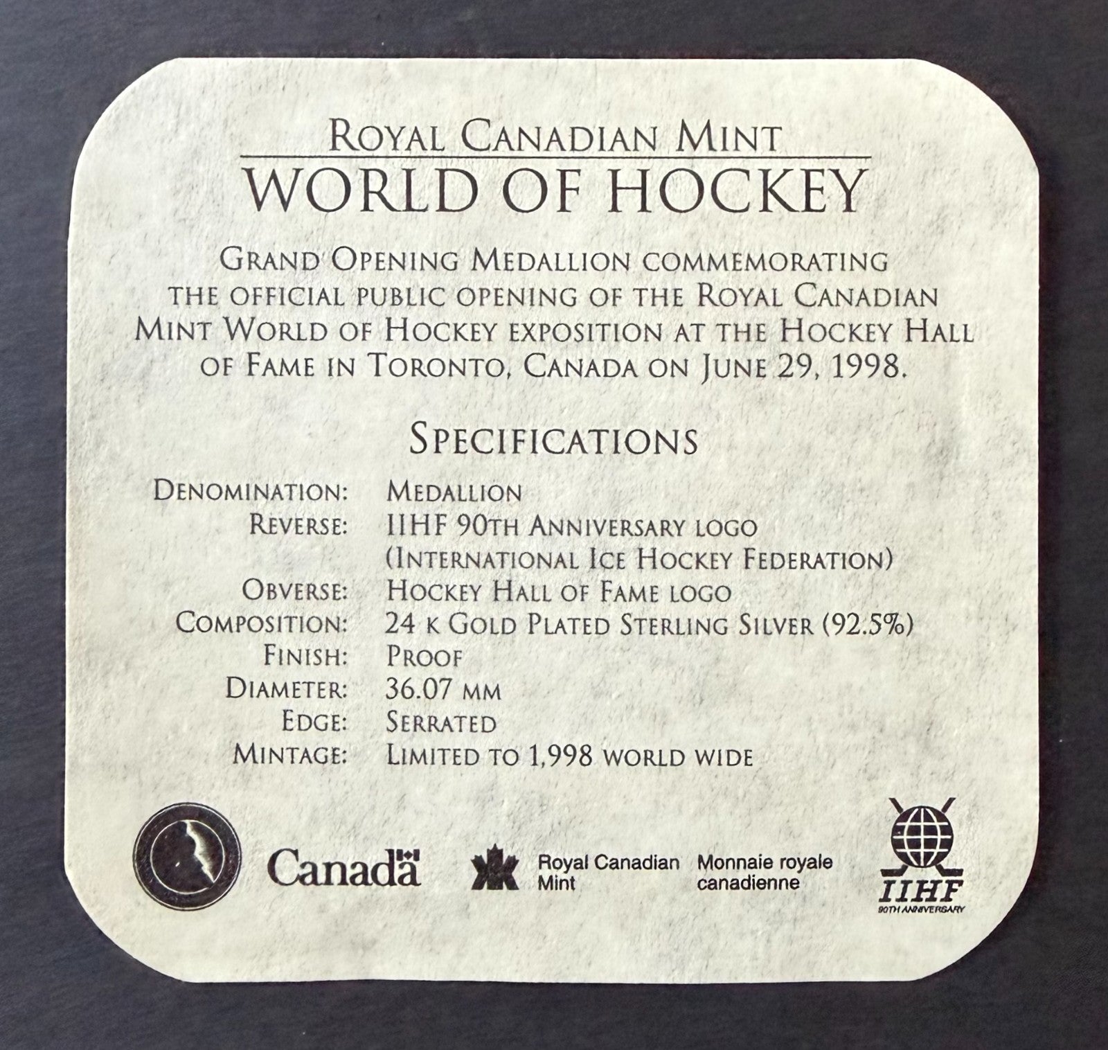 - Limited Edition Canadian Mint 90th Anniversary IIHF Gold Plated Silver Coin