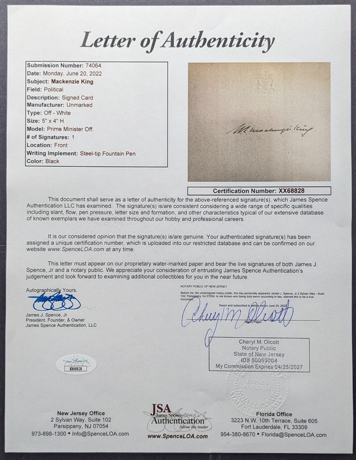 William Lyon Mackenzie King Autographed Signed Card Canada Historical JSA LOA
