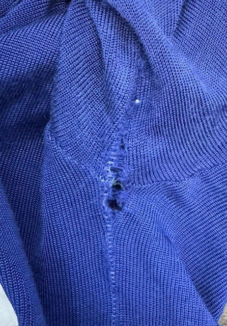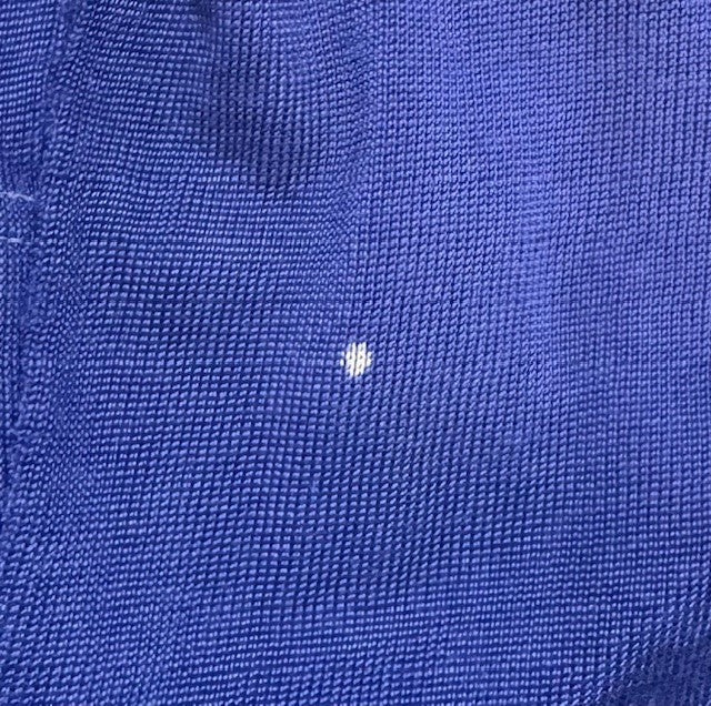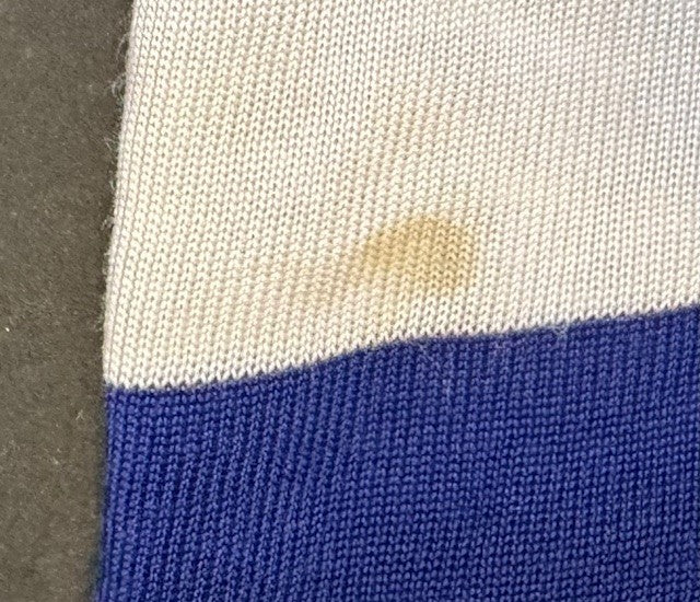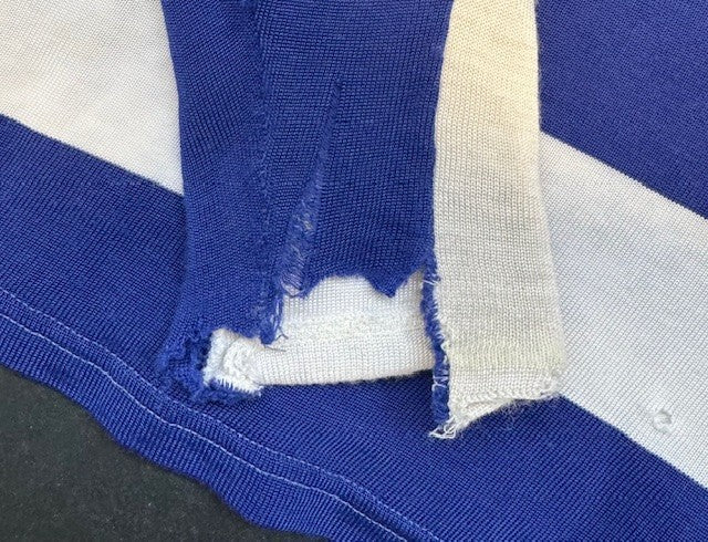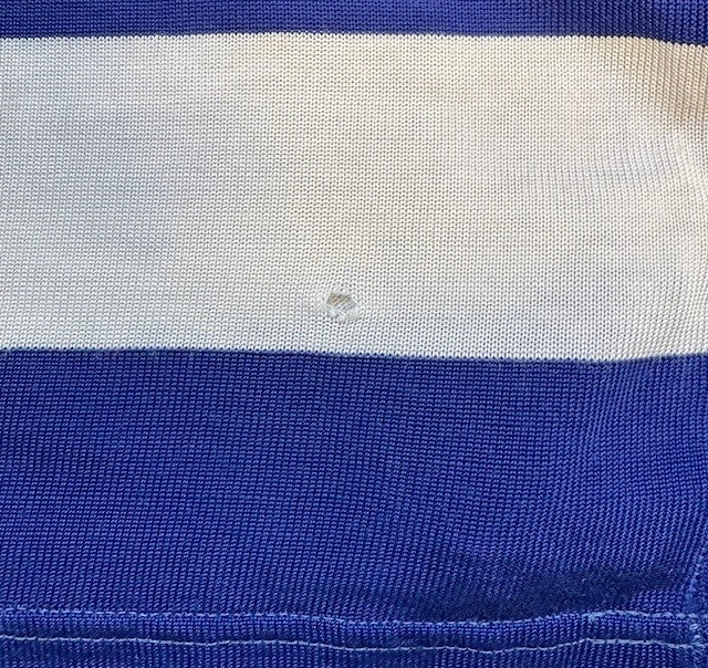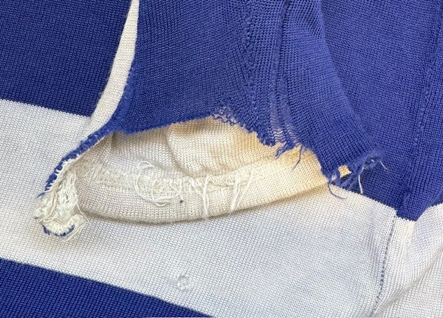 - Very good condition; some notable wear and tearing on the wrists. A small hole on front white stripe and some seem splitting underneath left armpit. A few small spots of discoloration. Some thread fraying on reverse #1