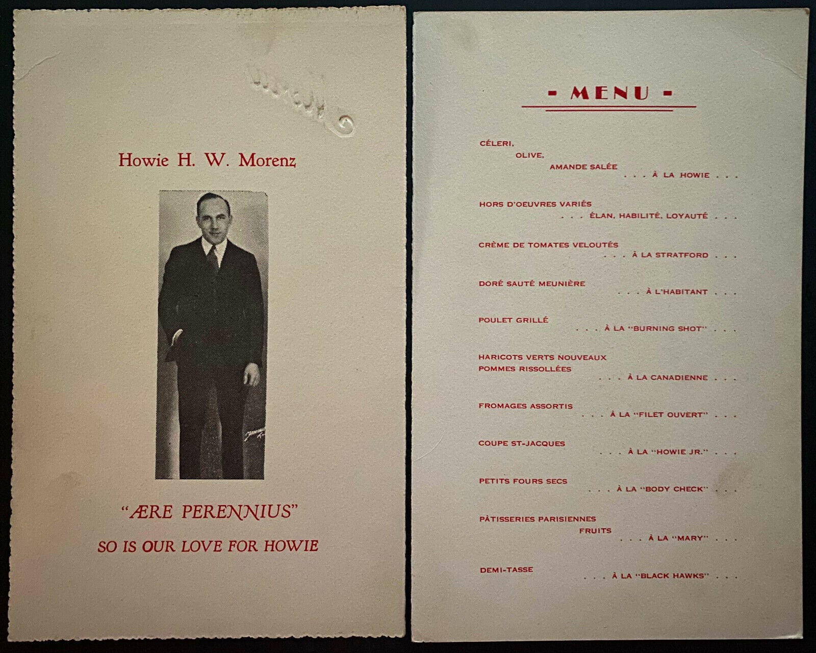 • The directors of the Montreal Canadiens board of directors host a dinner to honor Howie Morenz October 11th, 1934 just 8 days after trading him to the Chicago Blackhawks. Menu is from Montreal restaurant where the even took placeand has Morenz photo inside