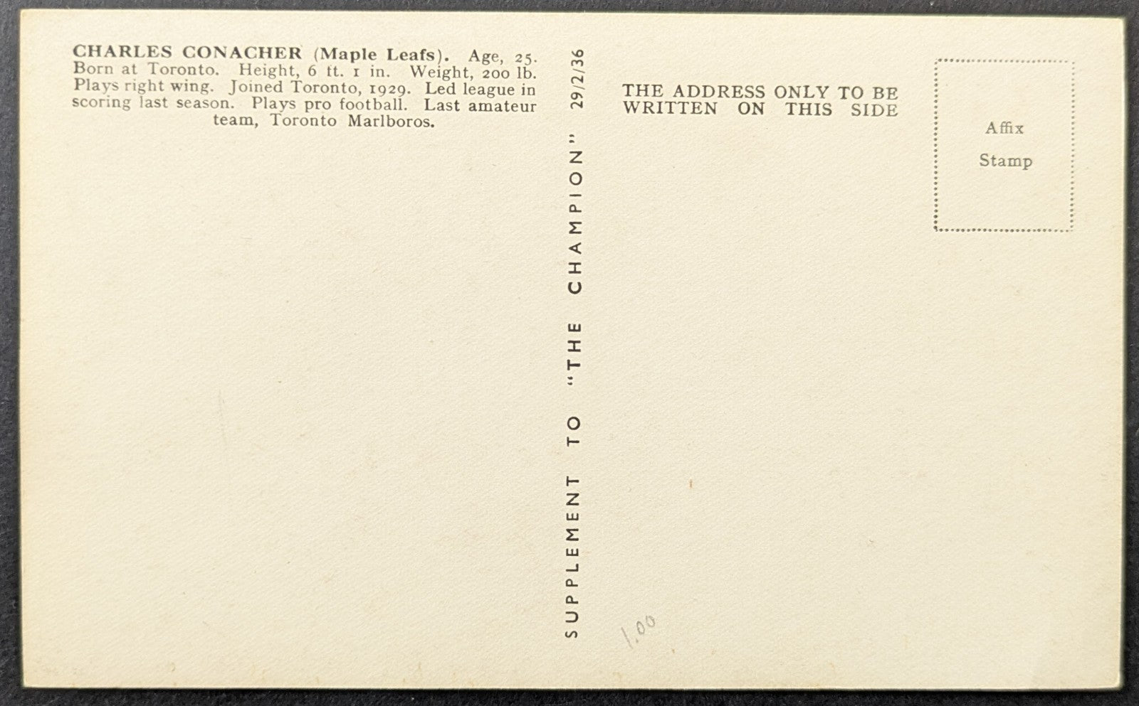 - 1935 Supplement To "The Champion" Charlie Conacher Toronto Maple Leafs NHL postcard