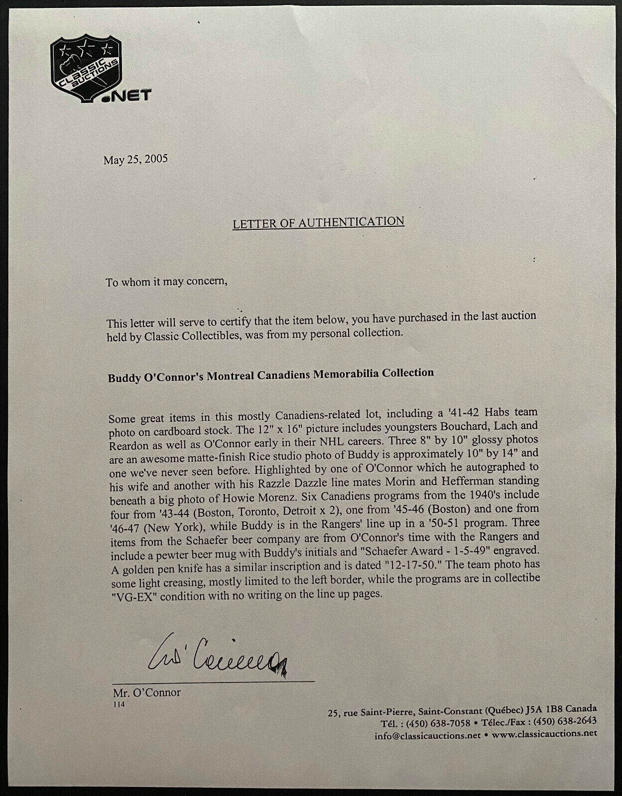 - 1940's Buddy O'Connr Canadiens HOFer Rice Studio Photo + Presentation Folder