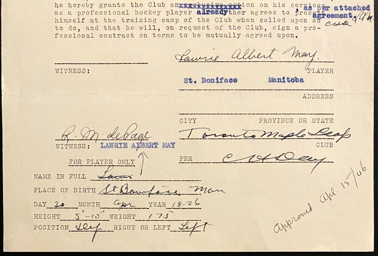 • April 11, 1946 Option Agreement Contract between the Toronto Maple Leafs and player Lawrie May