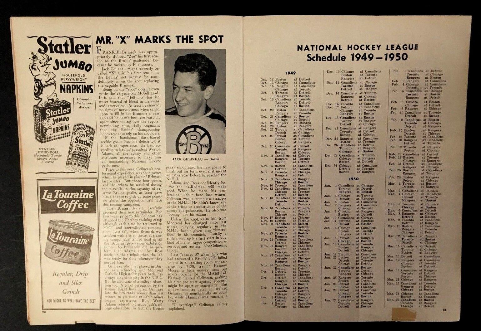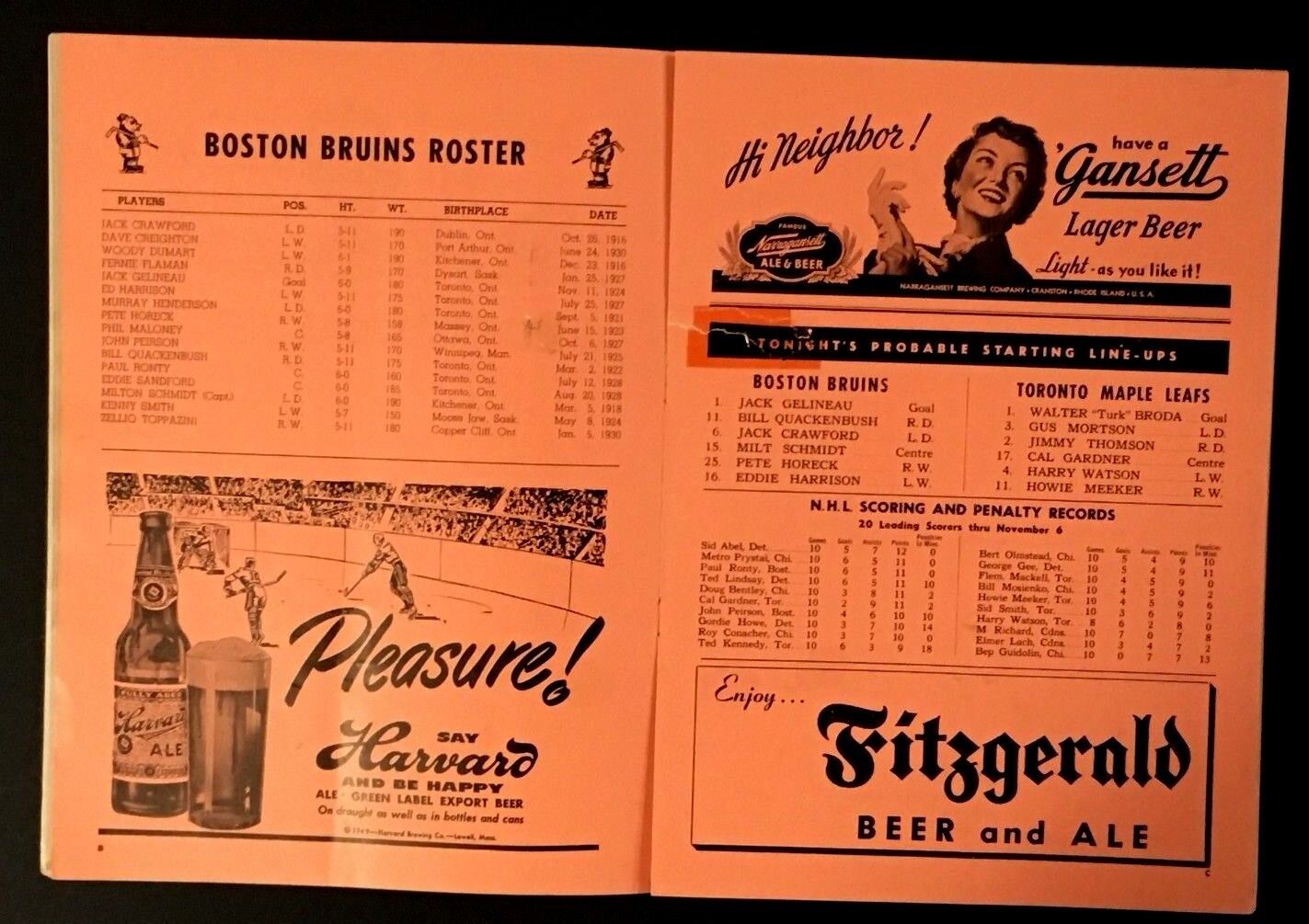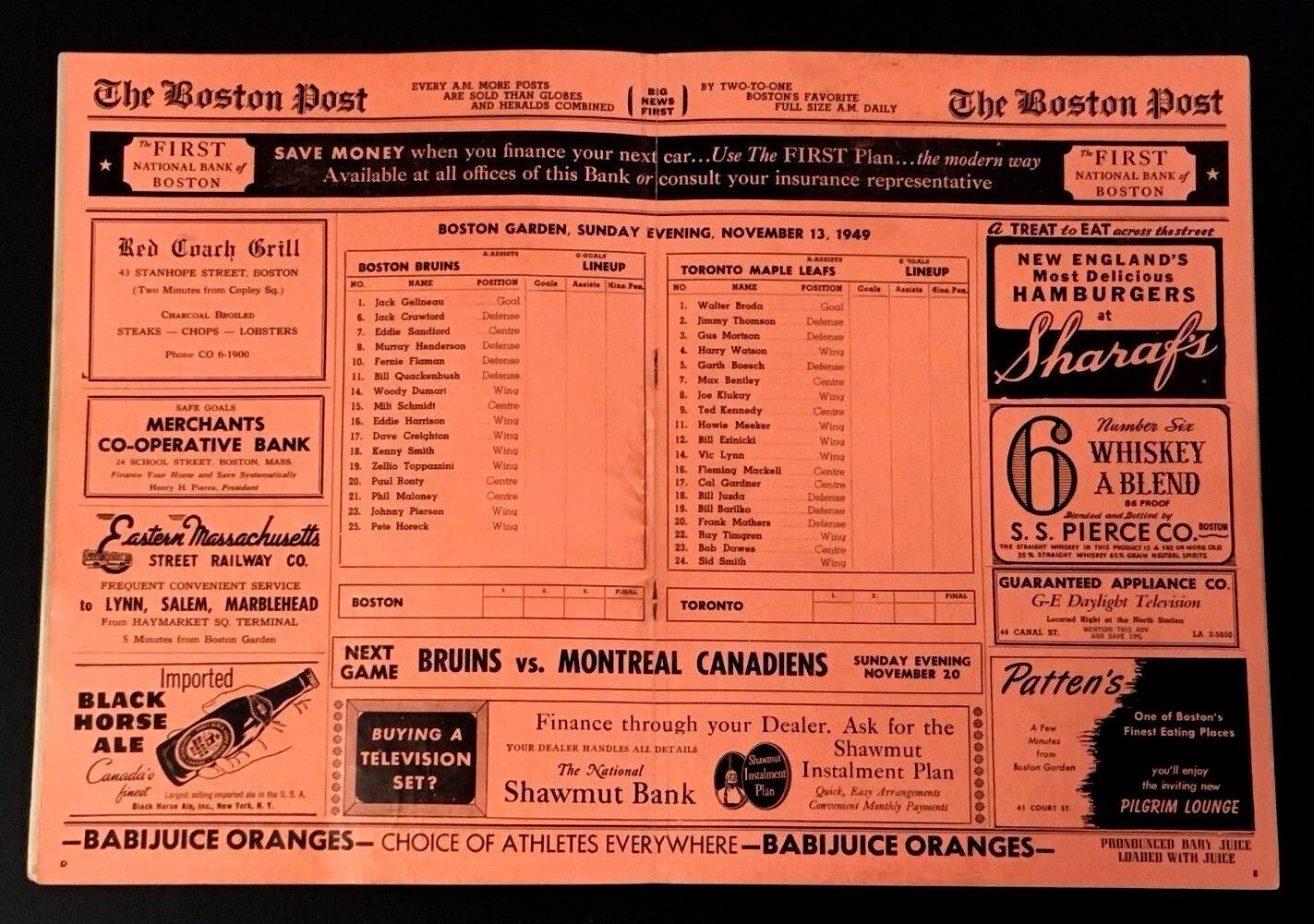 - November 13th, 1949 at Boston Gardens Boston Bruins beat the Toronto Maple Leafs 4-2 for Bruins 1st win in 9 starts.