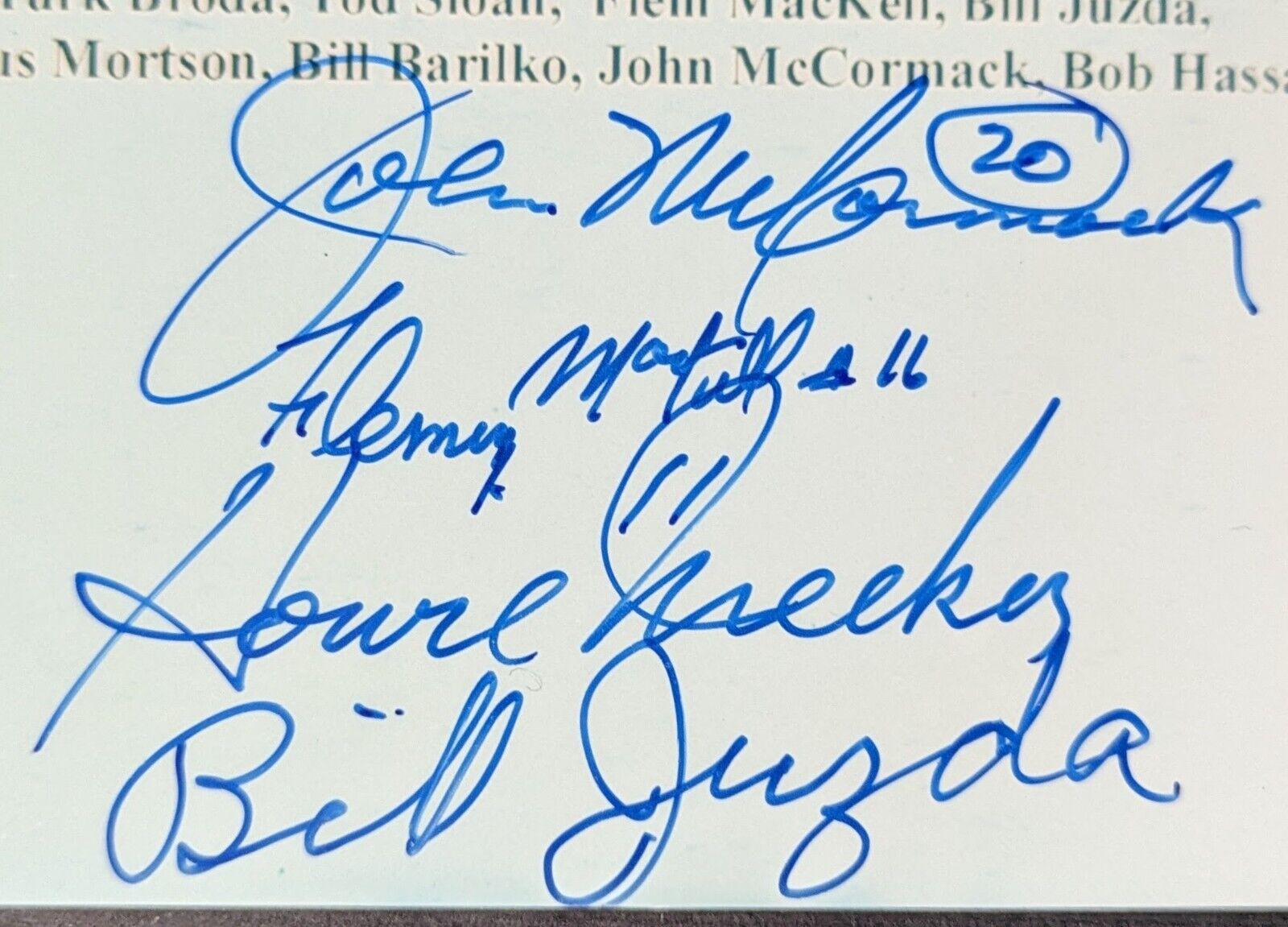 • Autographed by Hall of Famers Harry Watson, Ted Kennedy, Howie Meeker. Also signed by Joe Klukay, Tod Sloan, Gus Mortson, Bill Juzda, John McCormak, Flem MacKell, Danny Lewicki and Sid Smith