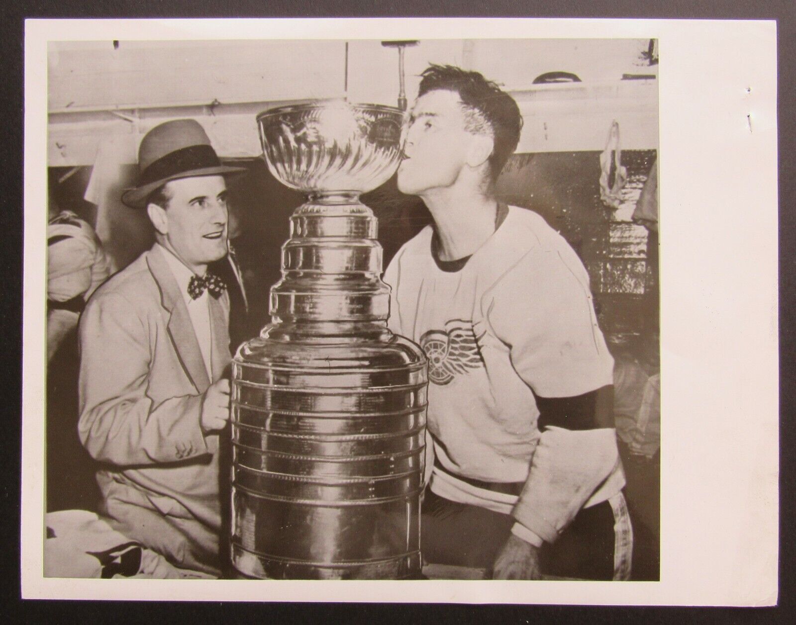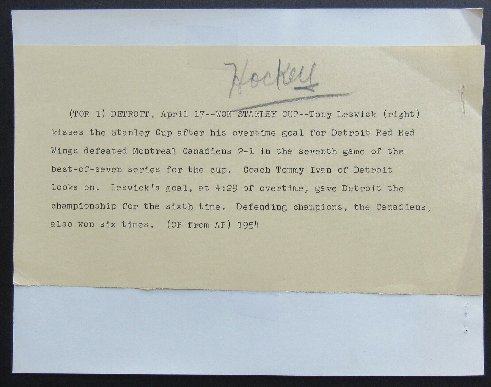 - April 17, 1954 Amazing press photo of Tony Leswick kissing cup in dressing room after game 7