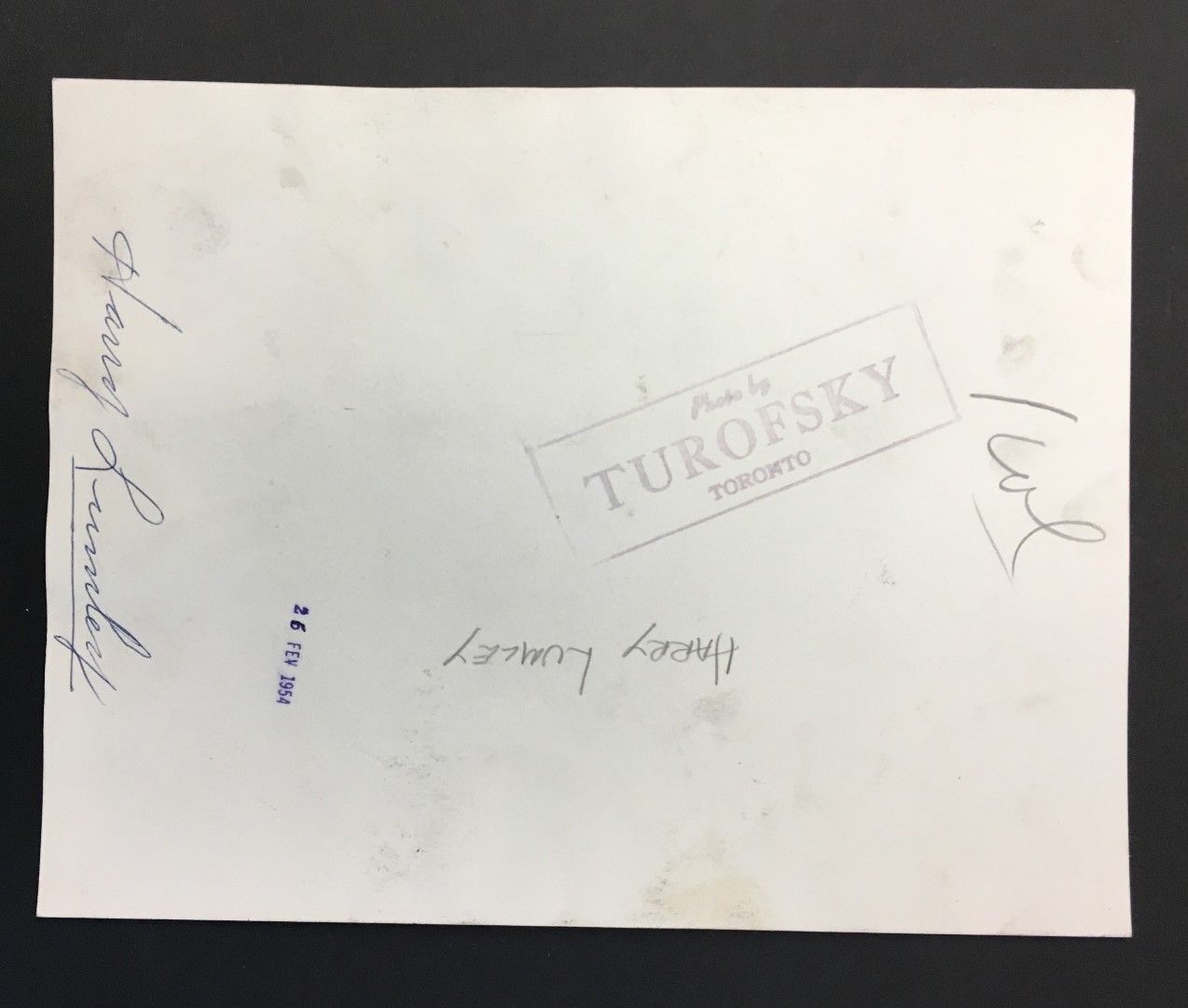 • Harry Lumley Hockey Hall Of Famer Turofsky Toronto photo. Date stamped on the back Feb 26, 1954