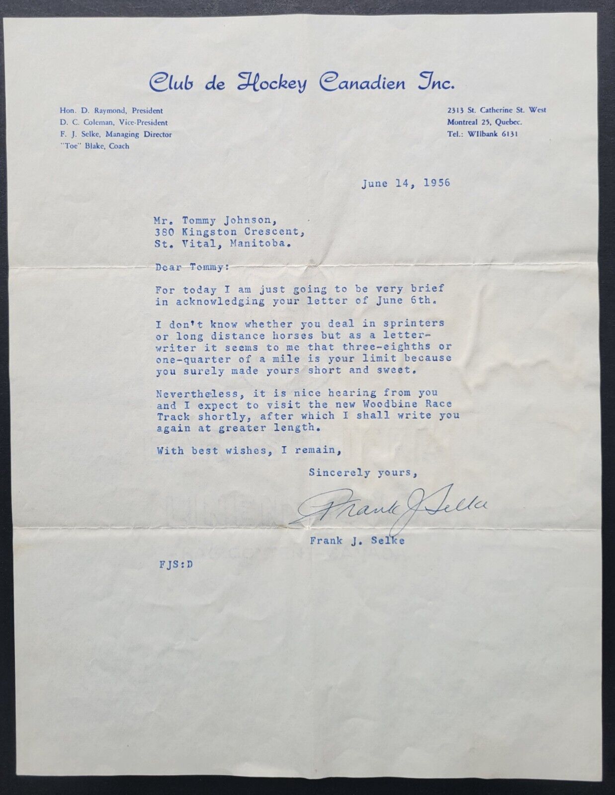 - Montreal Canadiens GM and Hockey Hall of Famer Frank Selke signed letter, dated June 14, 1956 on Montreal Canadiens letterhead. Content of the letter seems to be a response to a man in the horse racing industry that wrote Selke a short letter.