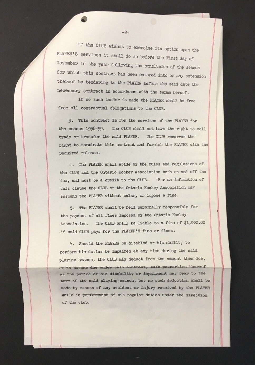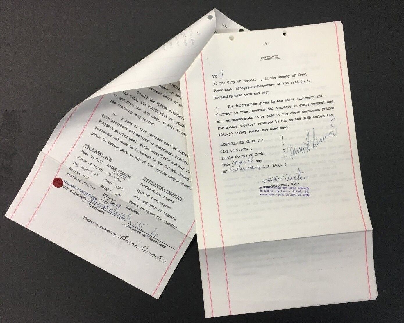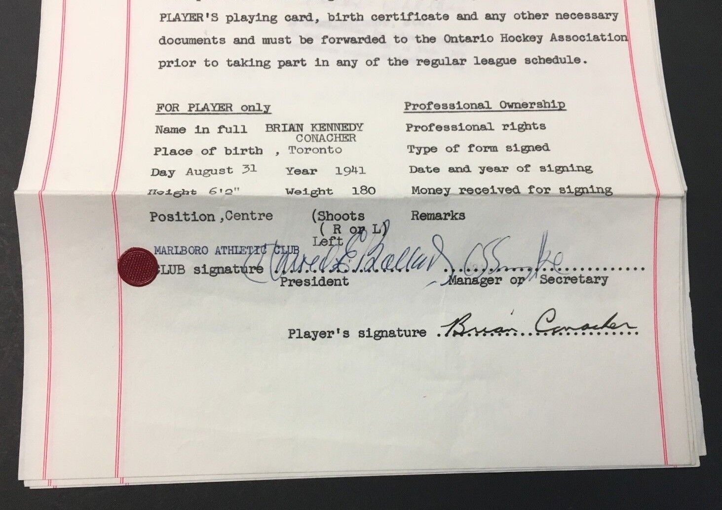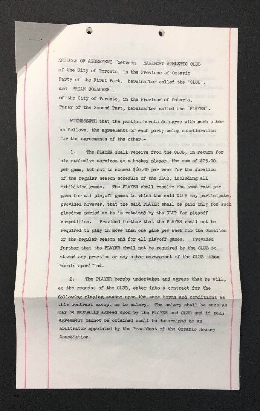 - 1959-1960 OHA Major Jr A hockey contract between the Toronto Marlboros Athletic Club and Brian Conacher. The contract is signed by Conacher, Marlboro president Harold Ballard and Official Stafford Smythe.