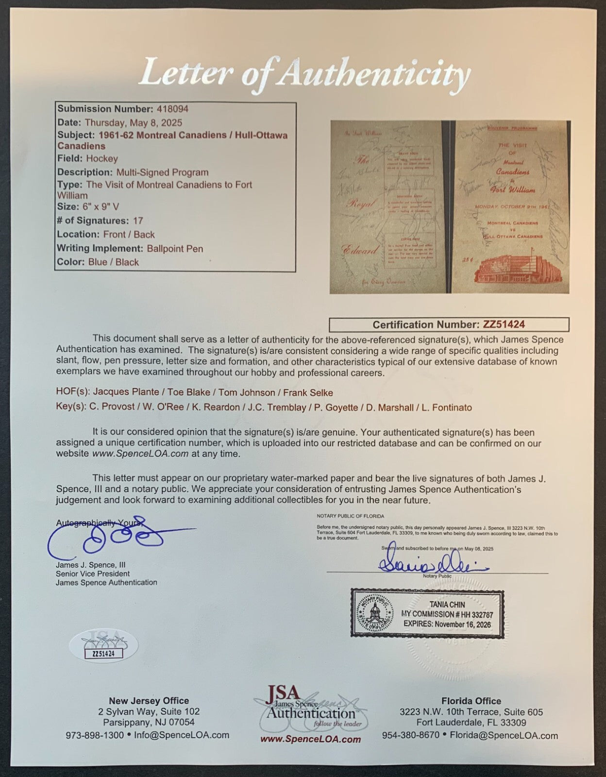 - Signatures on front and back cover: Jacques Plante (HOF), Danny Sullivan (HOF announcer), Frank J. Selke (Canadiens GM HOF), Toe Blake (coach/HOF), Lou Fontinato, Claude Provost, Kenny Reardon (HOF), Tom Johnson (HOF), Phil Goyette, Jean Gruthers, Don Marshall, and J.C. Tremblay