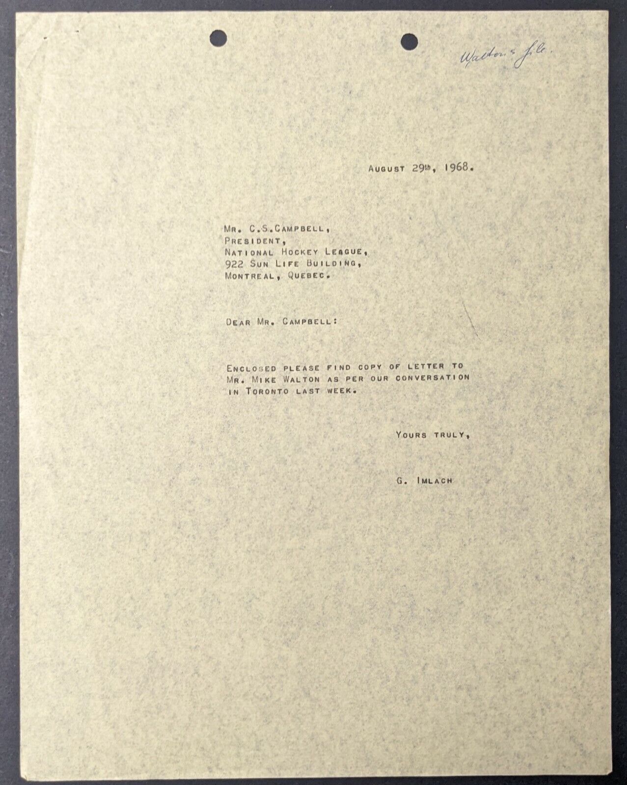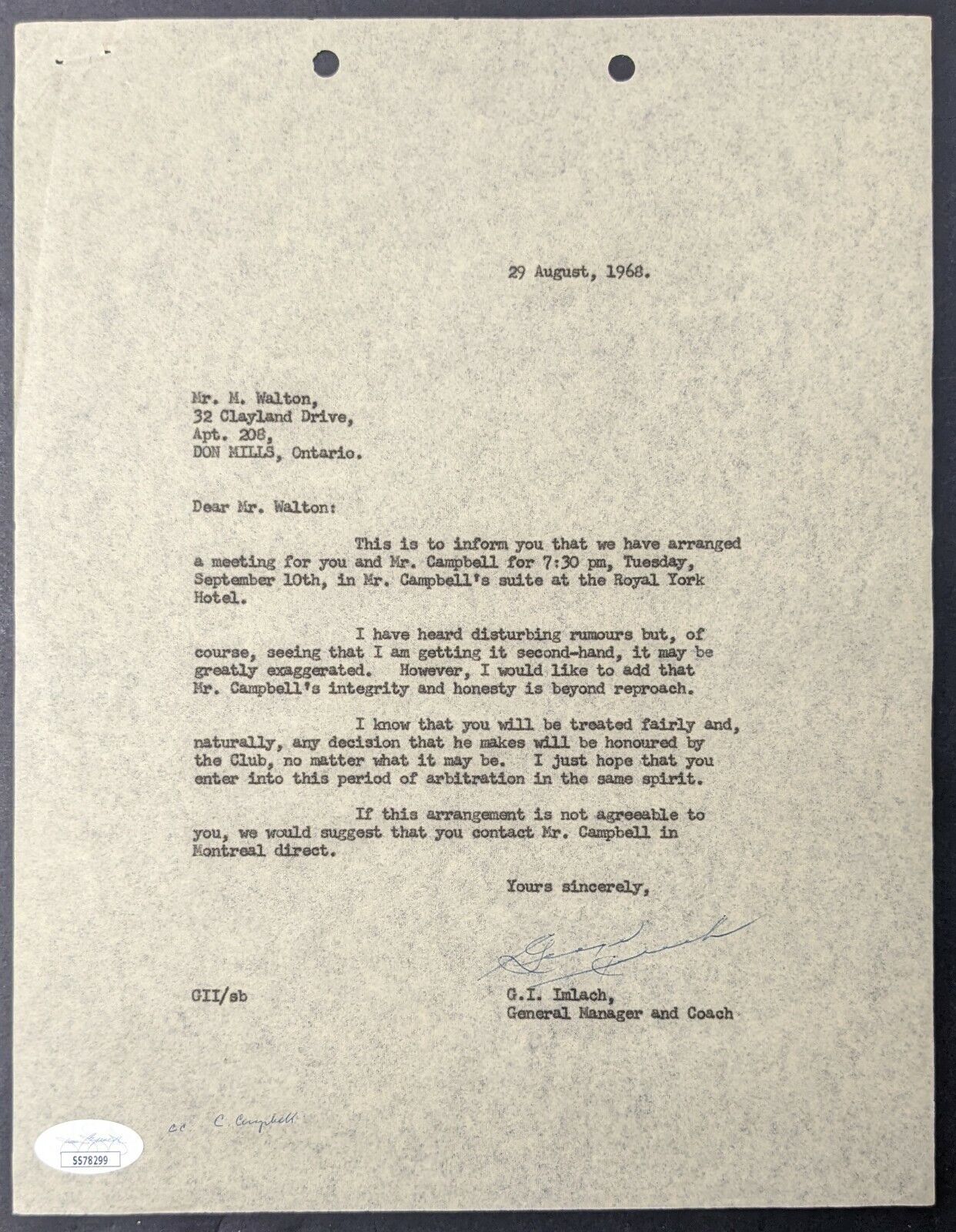 1968 Punch Imlach Autographed Signed Letter Toronto Maple Leafs NHL Hockey VTG