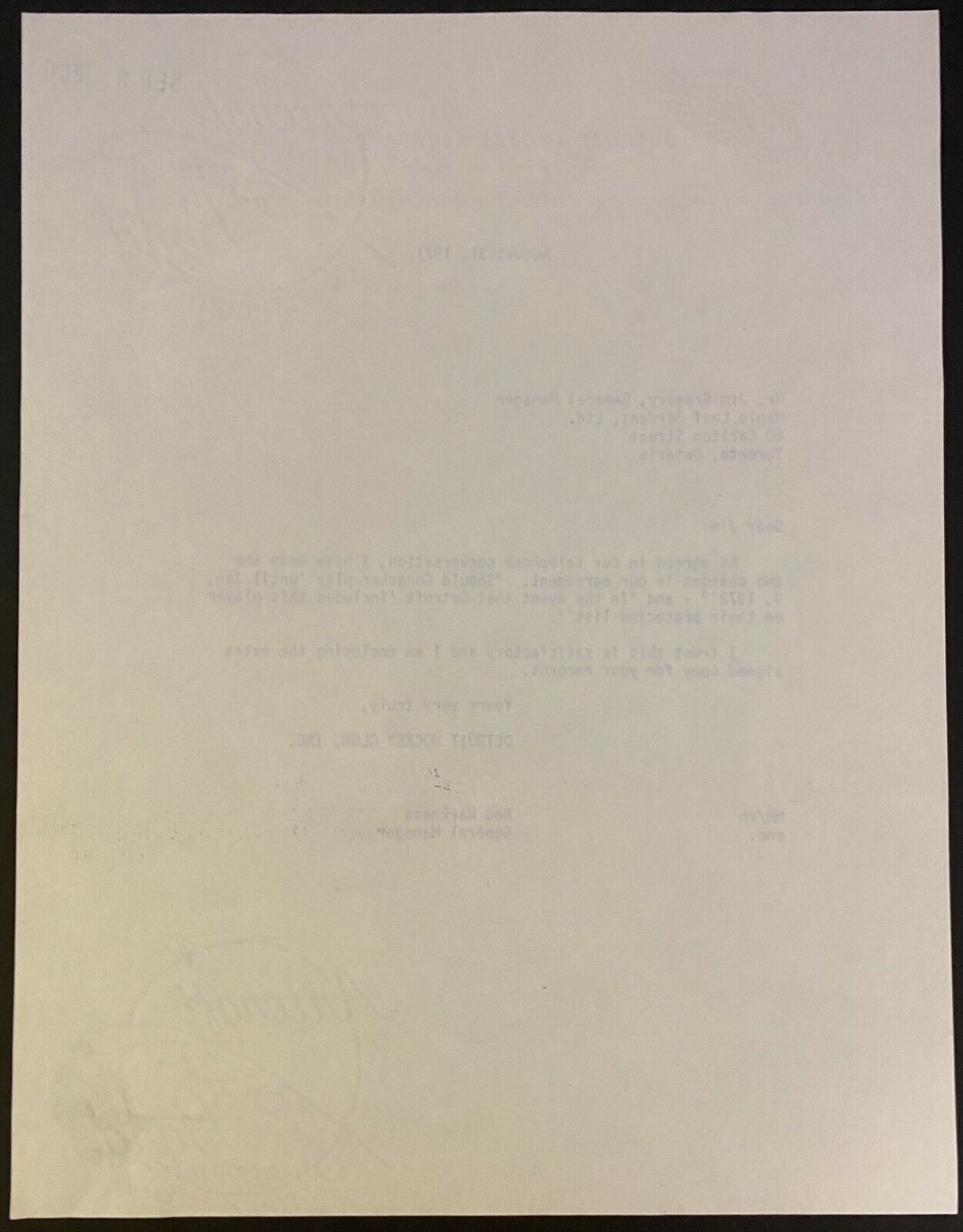 - Second letter is dated August 31, 1971 on Detroit Hockey Club, Inc. letterhead and signed (first name only) by Ned Harkness. Letter is acknowledging the amendments made by Harkness