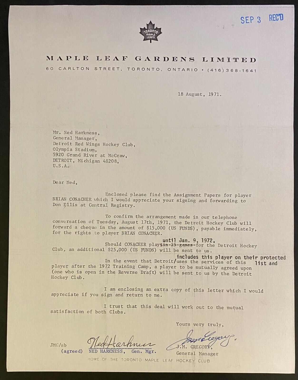 - First letter is dated August 18, 1971 on Maple Leaf Gardens letterhead and signed by both Ned Harkness and Jim Gregory. Letter is regarding the trade for Brian Conacher including minor amendments to the contract