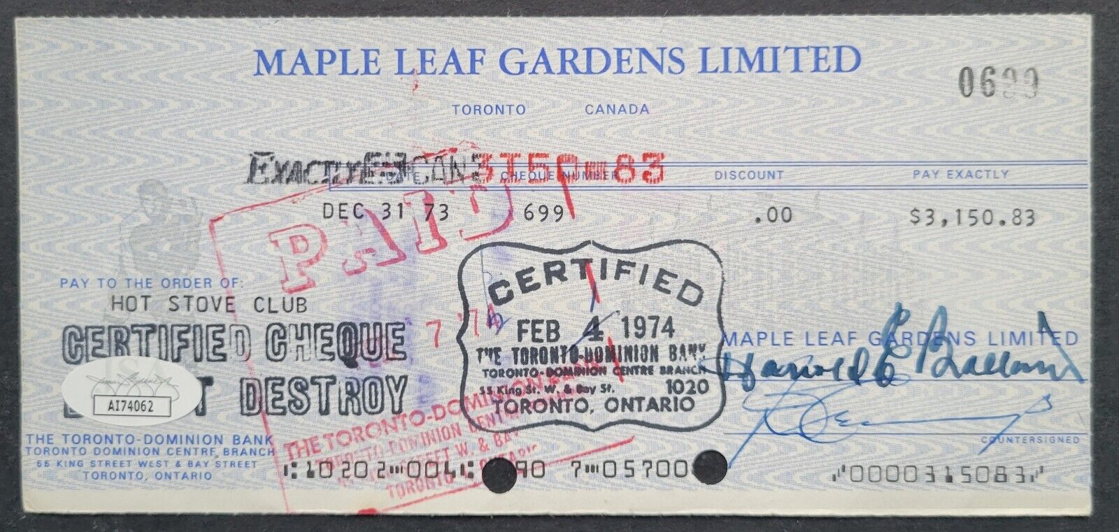 - Toronto Maple Leafs owner Harold Ballard Hall of Famer signed cheque payable to the venues private club "Hot Stove Club"