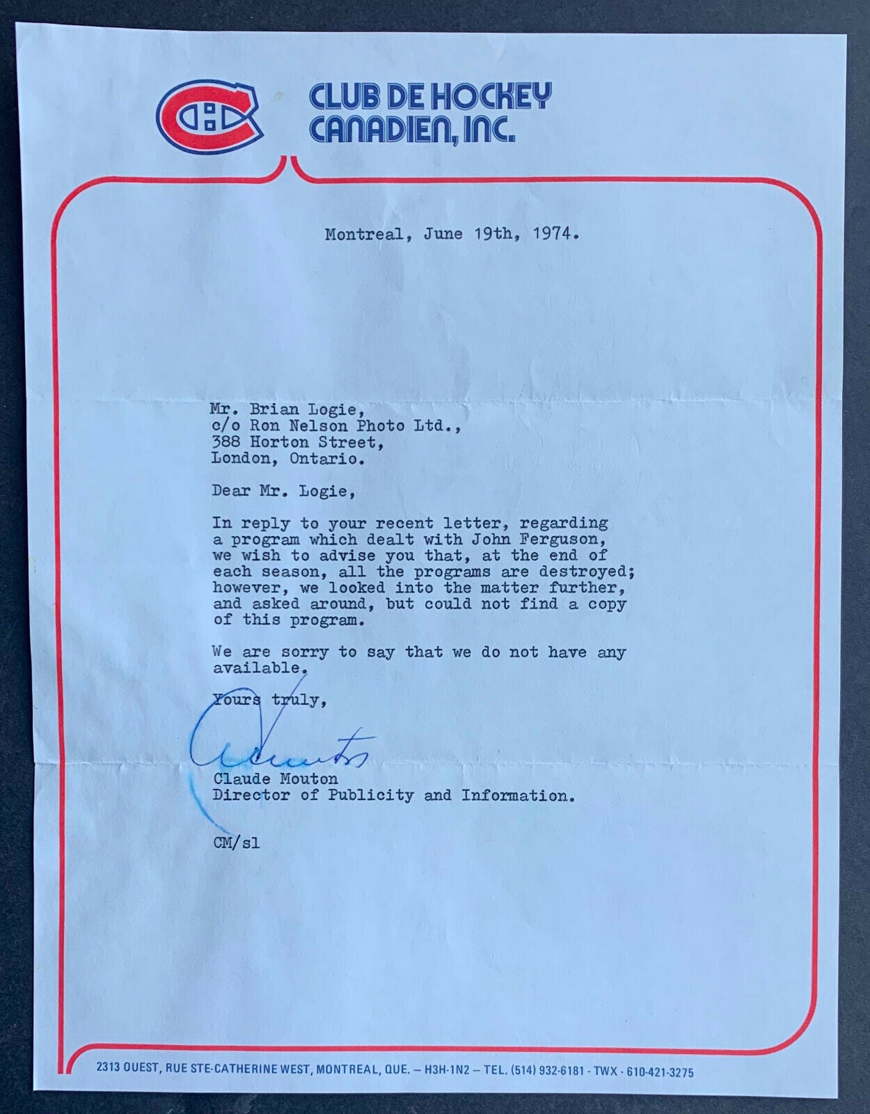 • June 19th 1974 Montreal Canadiens signed letter signed by Claude Mouton with original mailing envelope