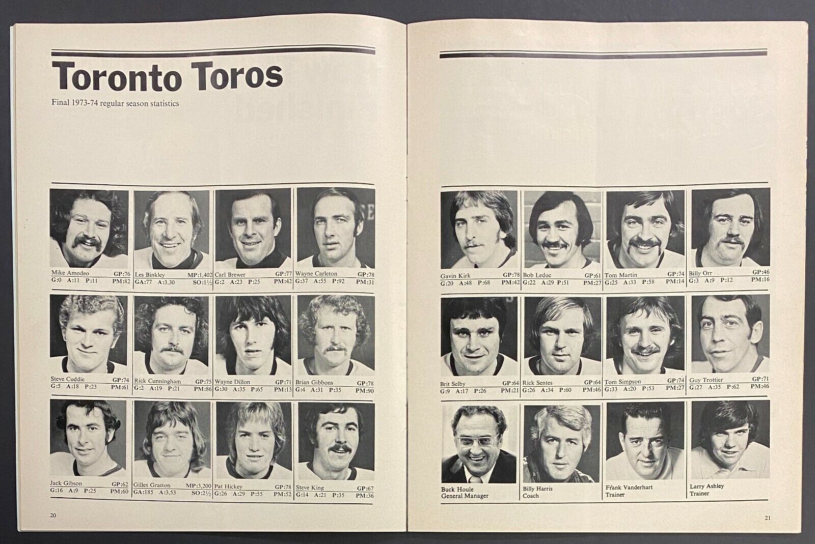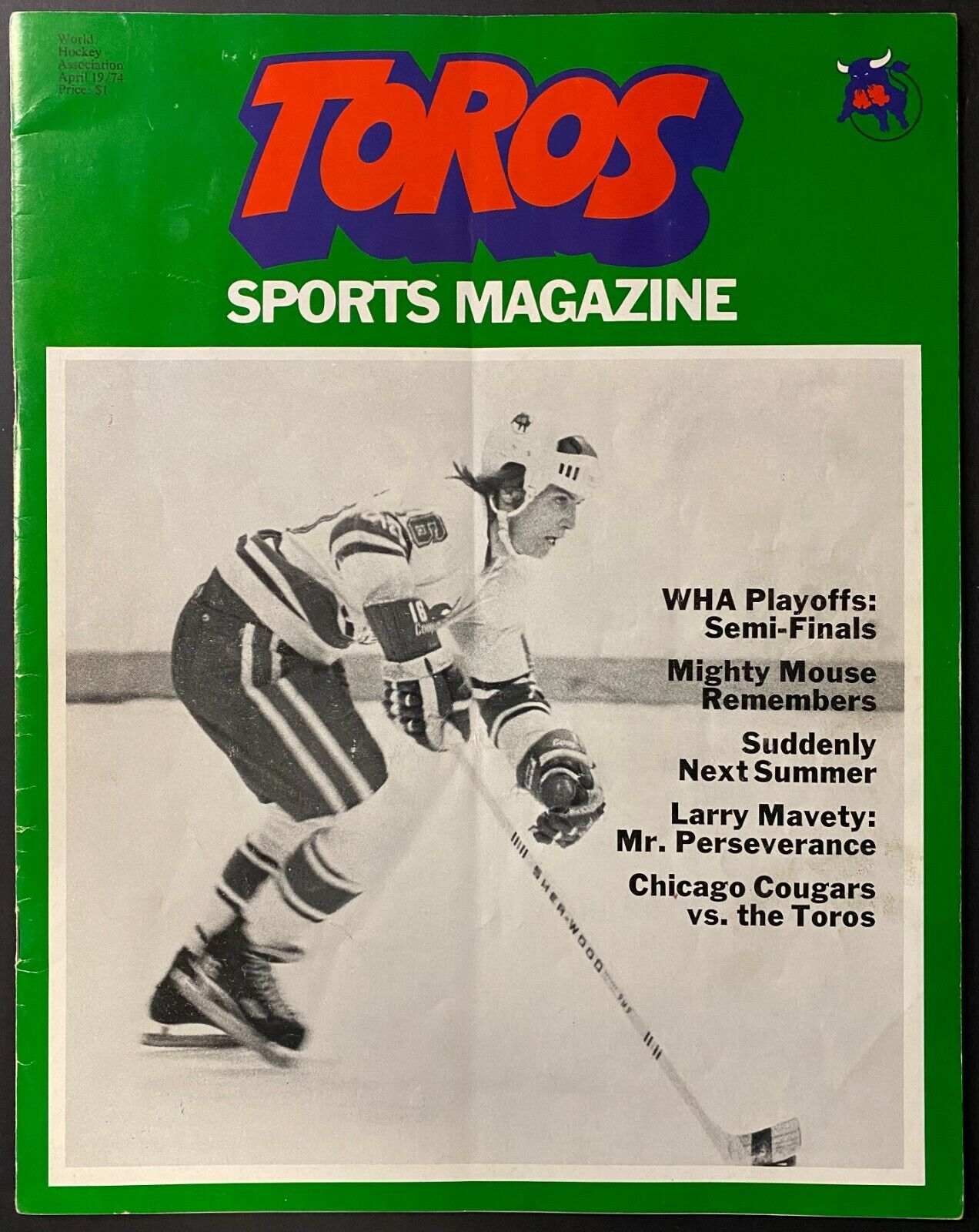 • April 19, 1974 WHA hockey game program for Game 1 of the second round of the 1974 WHA playoffs between the Toronto Toros and the the Chicago Cougars at the Maple Leaf Gardens in Toronto,
