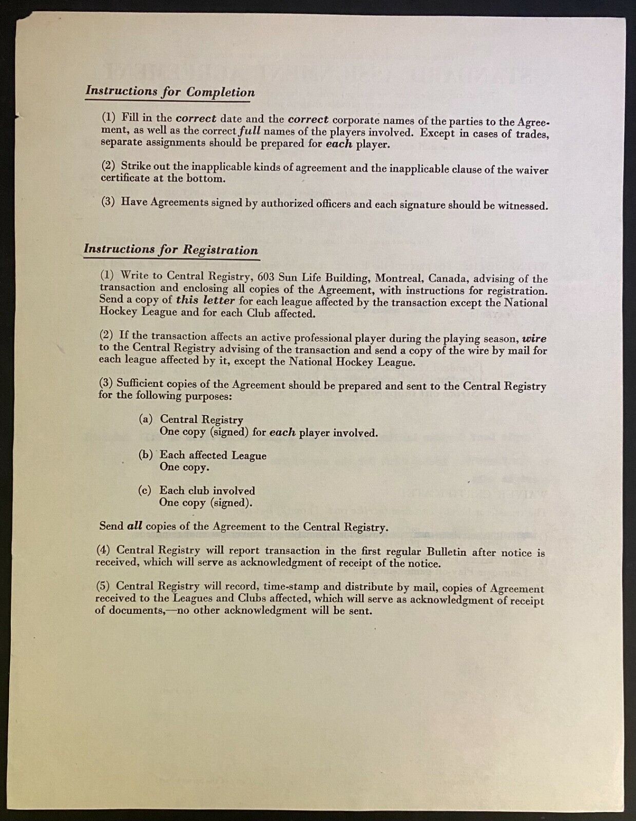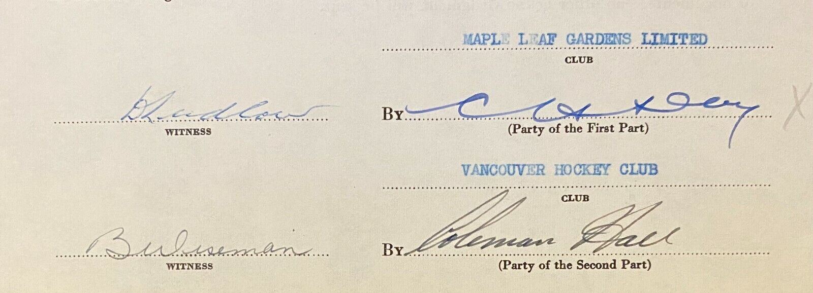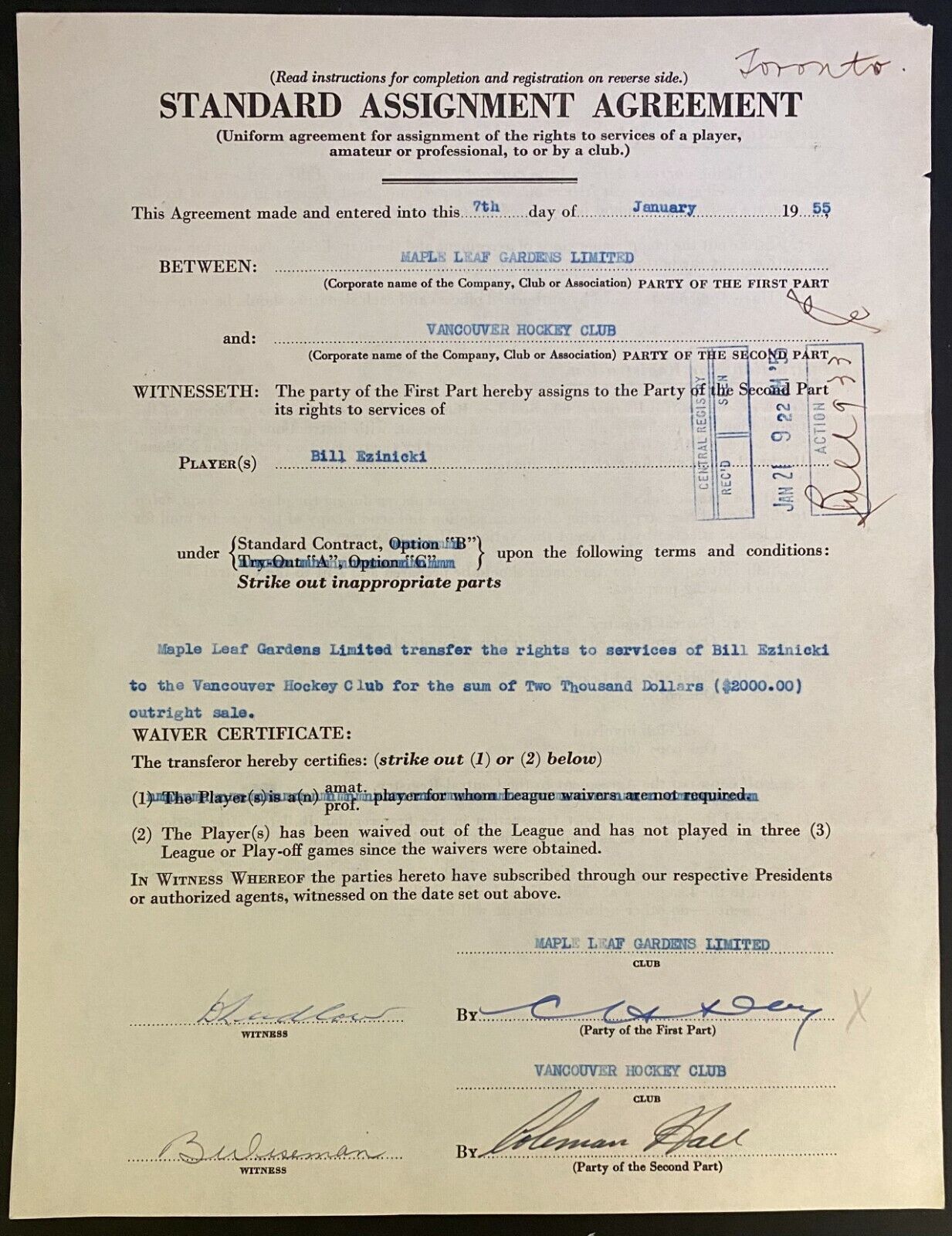 - January 7, 1955 Standard Assignment Agreement contract - Bill Ezinicki of the Toronto Maple Leafs assigned to the Vancouver Canucks of the WHL