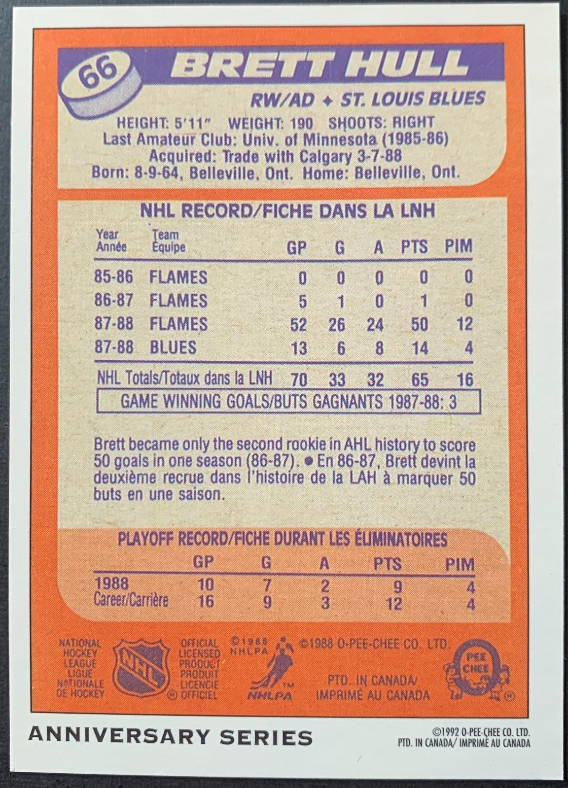 - 1992 25th Anniversary O-PEE-CHEE #66 Brett Hull Signed Autographed Card COA