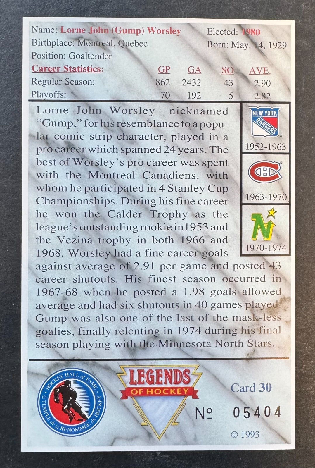 - 1993 Limited Edition Gump Worsley Signed Autographed Card