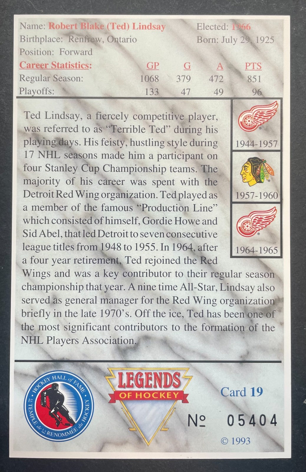 - 1993 Limited Edition Ted Lindsay Signed Legends of Hockey Card