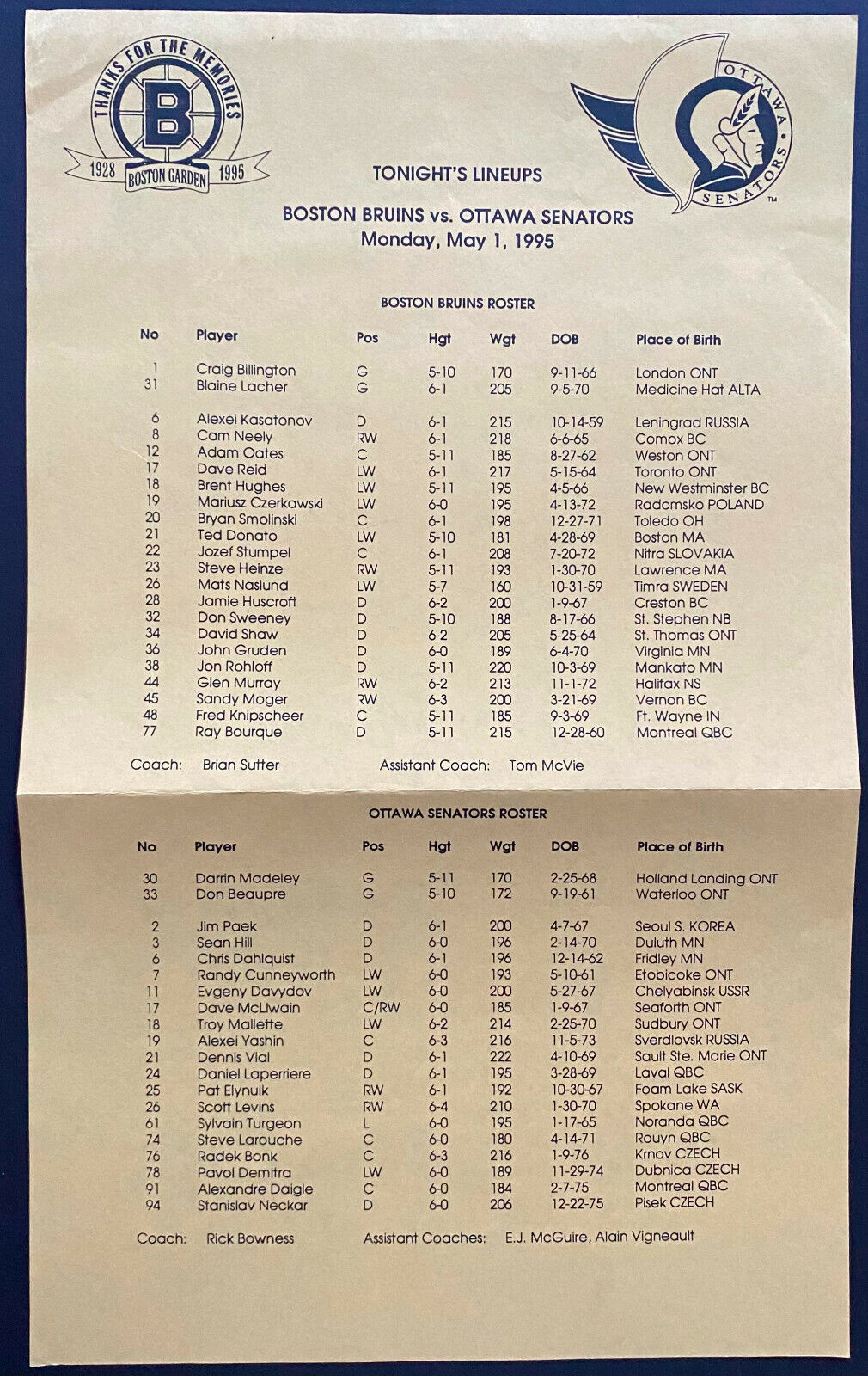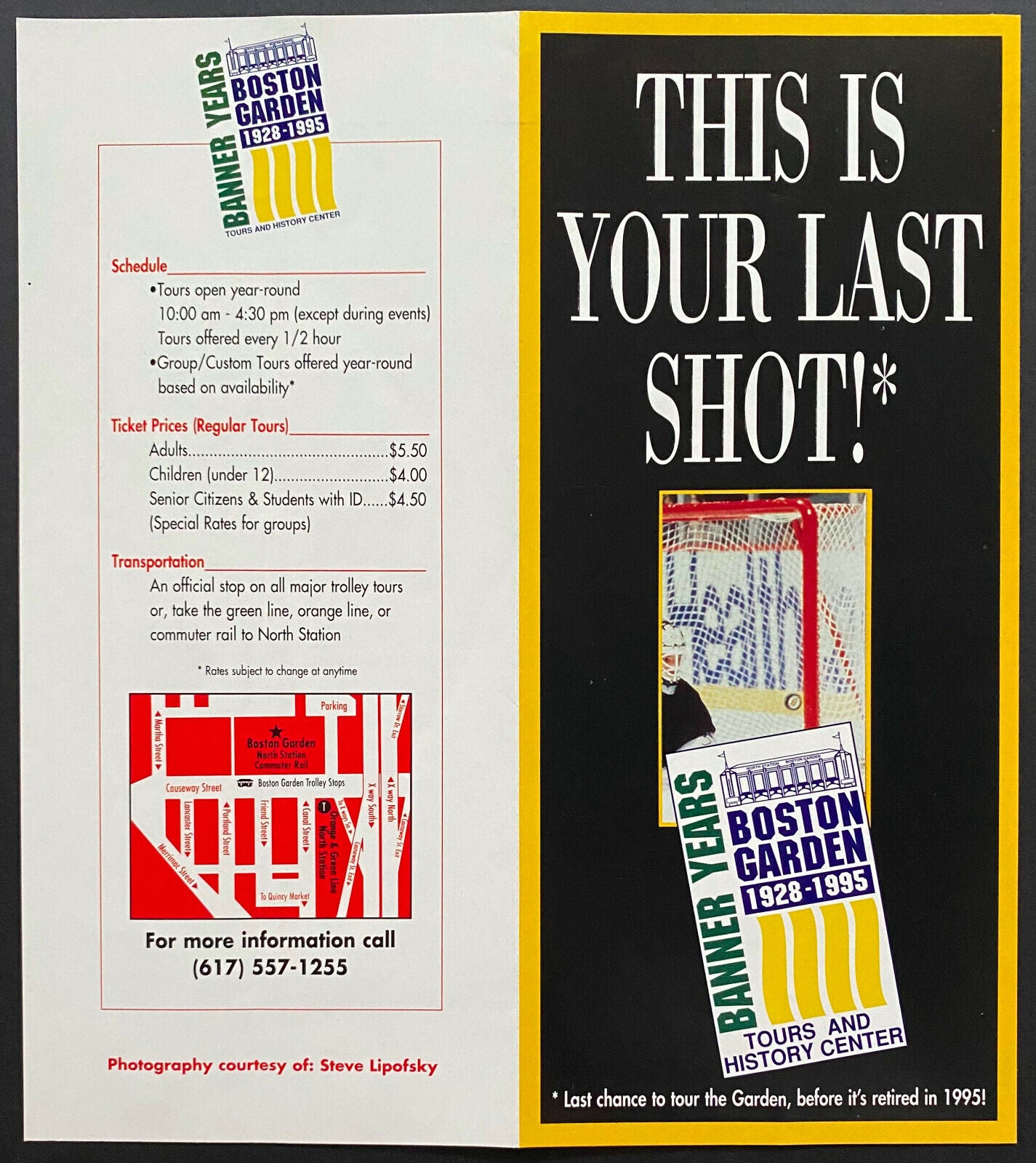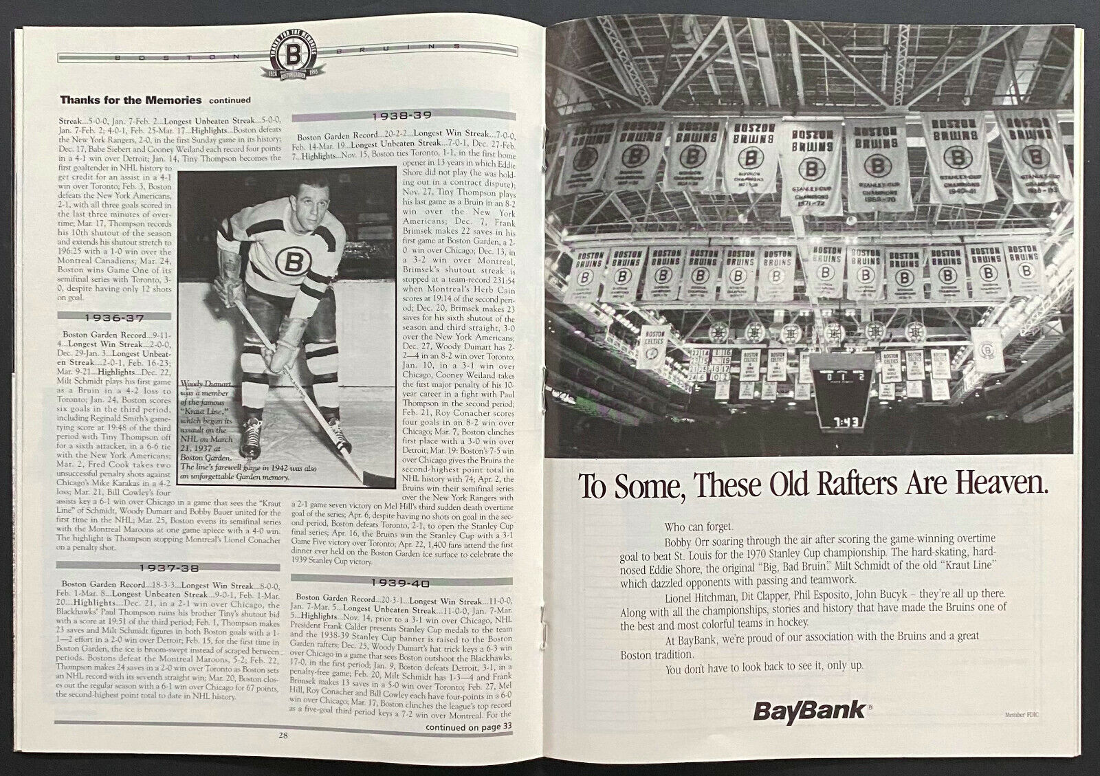 Final regular season game Boston Garden NHL hockey item lot that includes game day lineup card, Garden brochure, bag from Boston Garden + other items