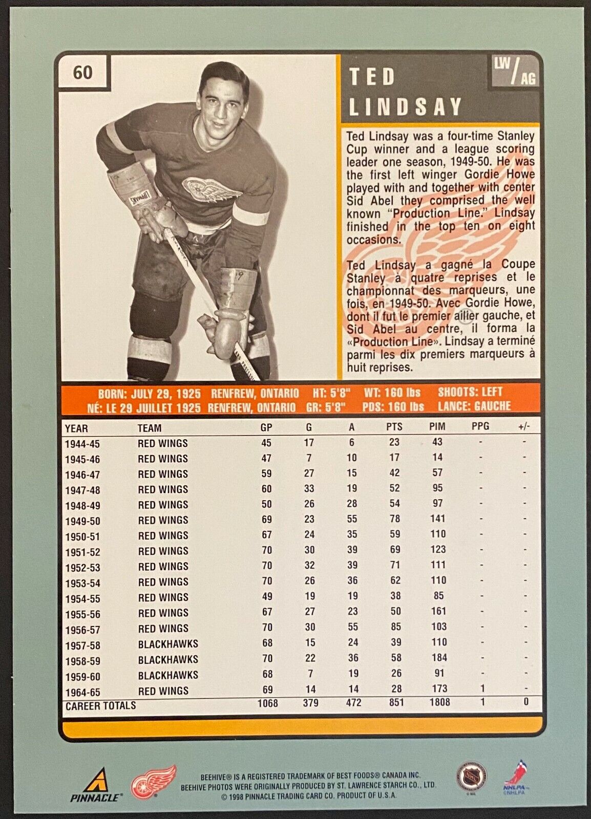 - 1997-98 autographed Ted Lindsay Detroit Red Wings Pinnacle Beehive over-sized hockey card
