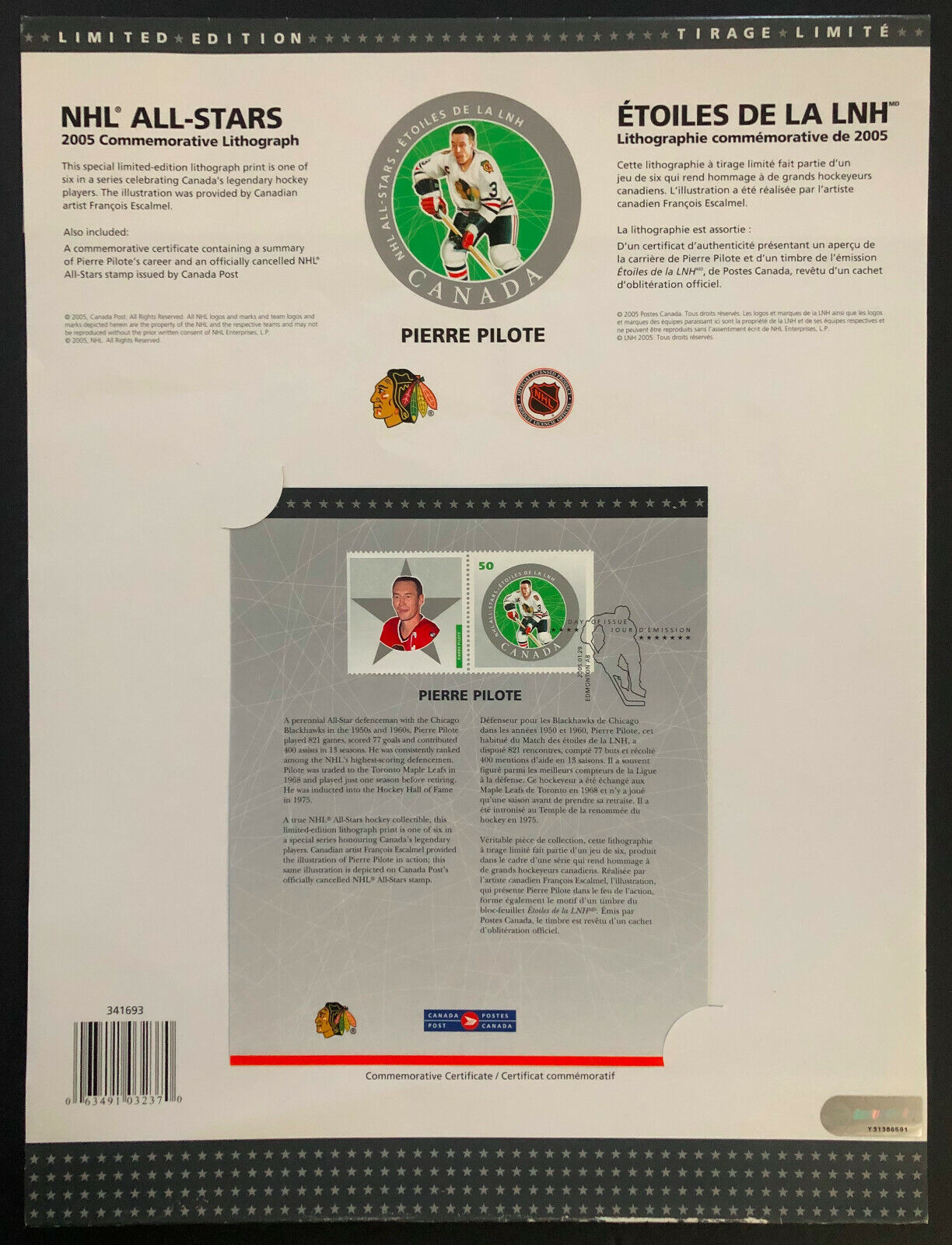 - 2005 Pierre Pilote autographed Canada Post stamp set with HOF 75 inscription