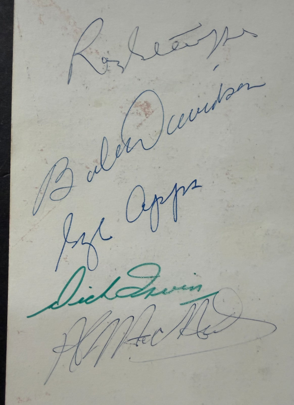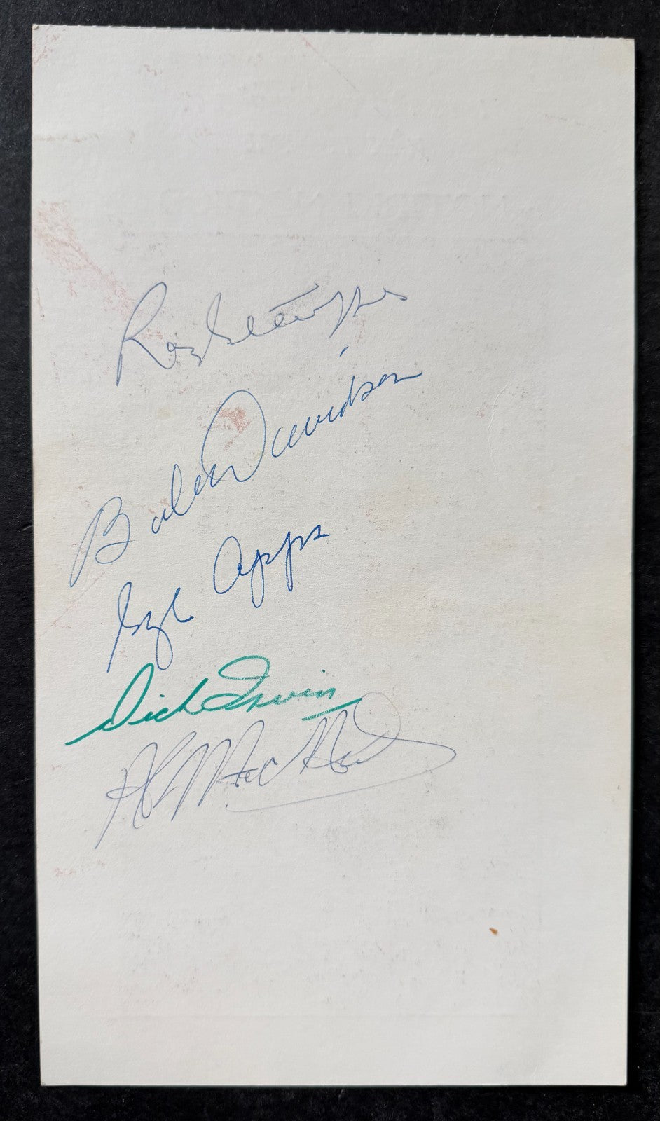 • Excellent condition; edges and corners are clean. Some spots of discoloration on reverse do not overly affect autographs. Minimal signs of visible handling wear. Autographs present well with no fading, bleeding or smudging