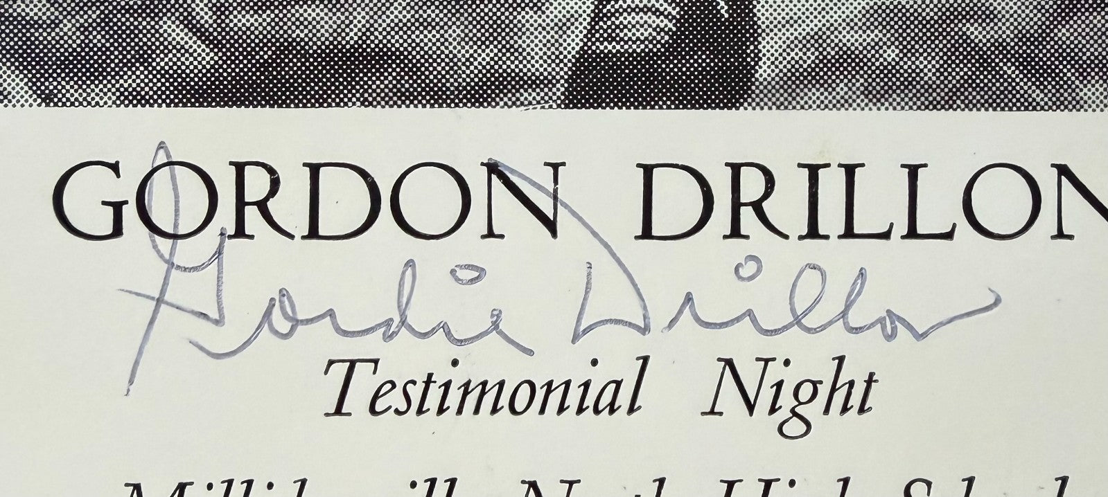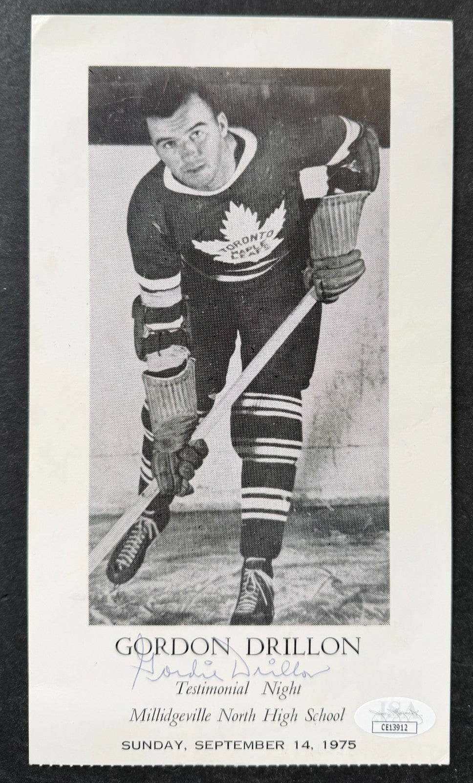 • Card from September 14th, 1975 Gordie Drillon NHL HOFer testimonial night dinner at Millidgeville North Highschool