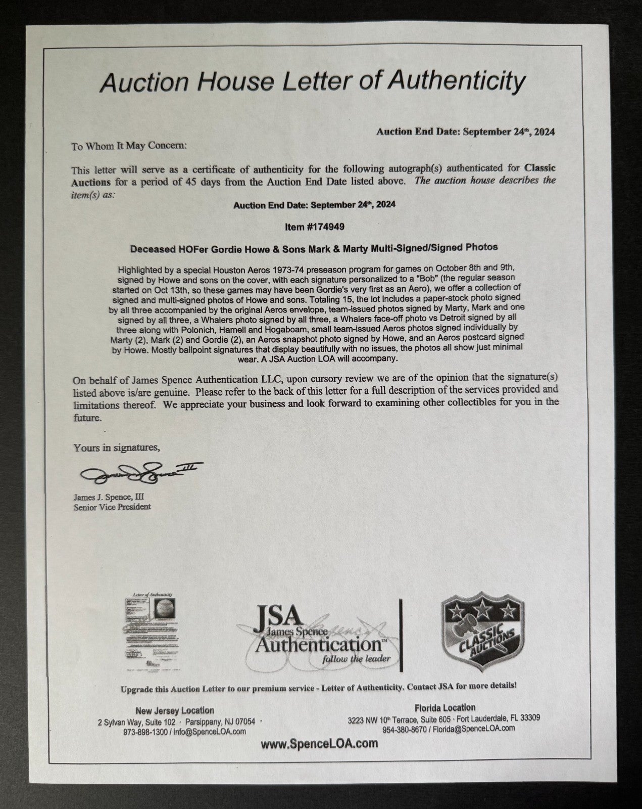 Circa 1974 Houston Aeros Gordie Howe Signed Polaroid LOA Rejean Hoyle WHA Hockey