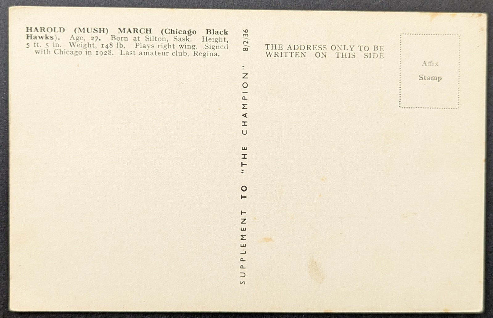 - Harold (Mush) March Chicago Black Hawks Champion postcard