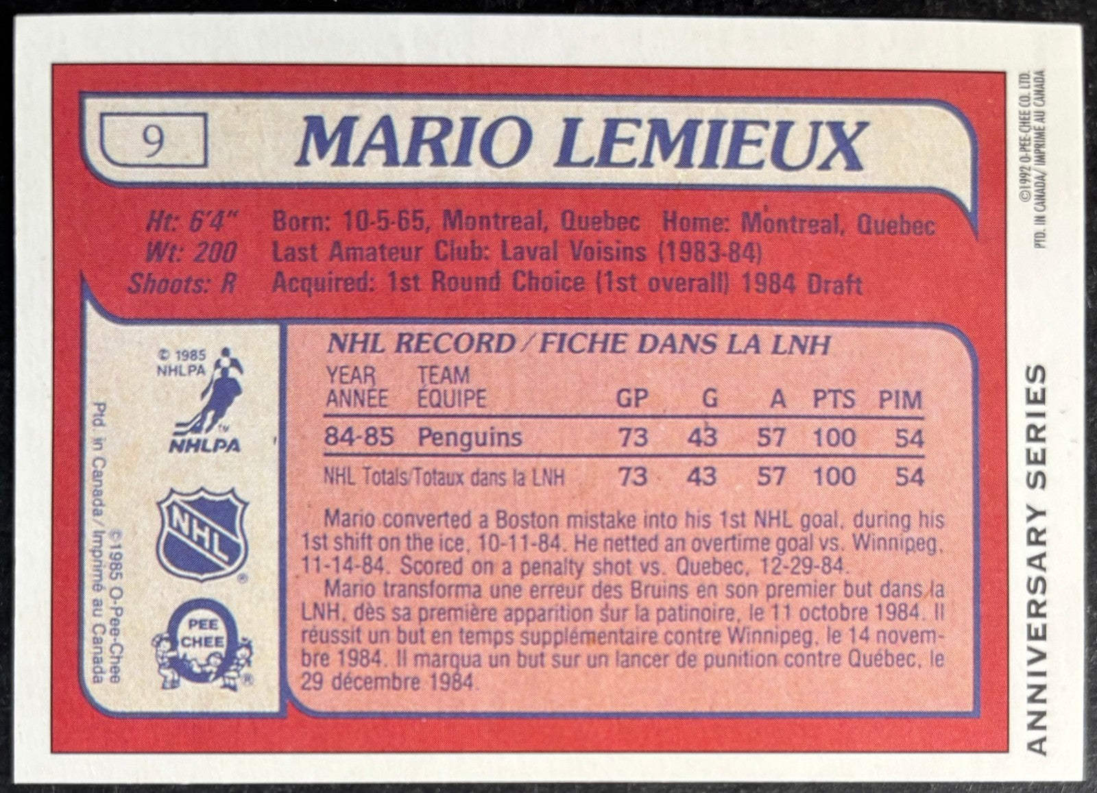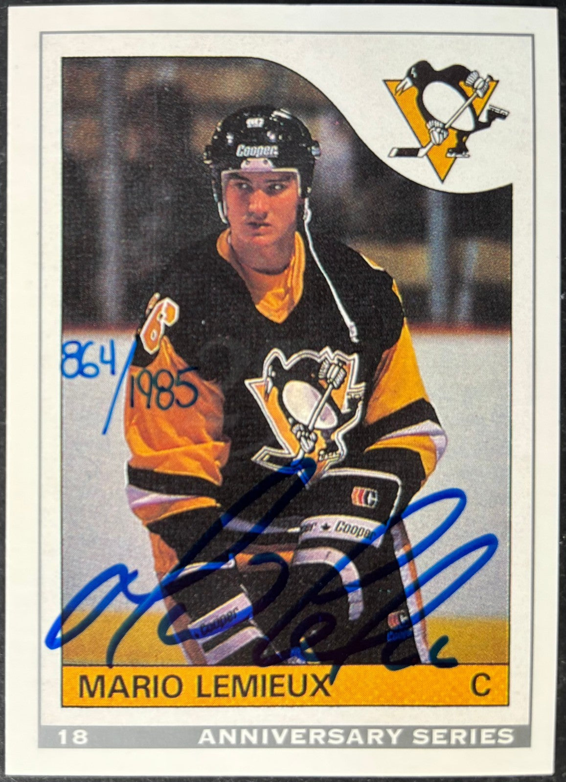 - 1992 Mario Lemieux Pittsburgh Penguins signed autographed OPC Anniversary Series trading card