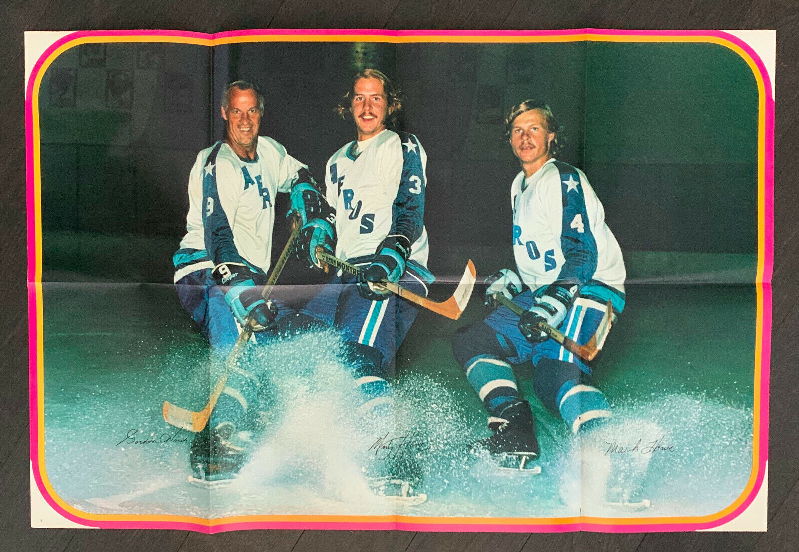 • Rare game issued "The Howes of Houston" foldout poster with game lineup card from October 3 / 1973 WHA game. Houston Aeros vs Winnipeg Jets