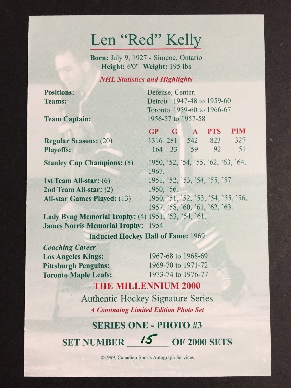 Red Kelly Autograph Hard Signed Authentic NHL Millenium Hockey Series Card