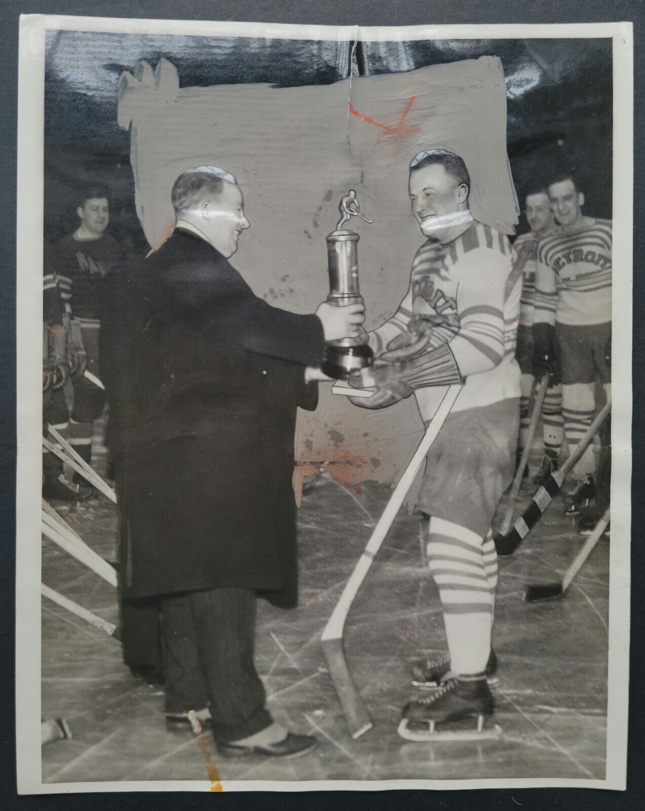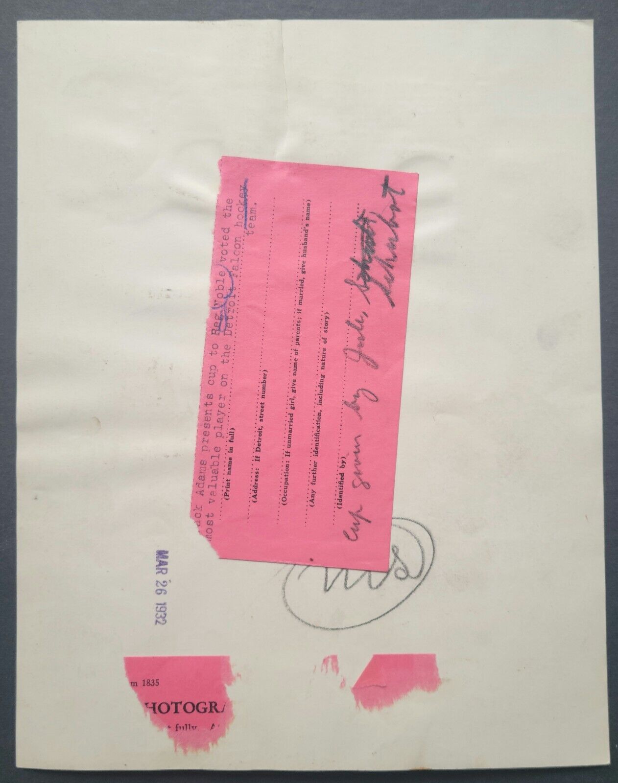 • Mar 26, 1932 photo of Adams at the end of the NHL regular season presents player Reg Noble with the Detroit Falcon's Most Valueable Player Trophy