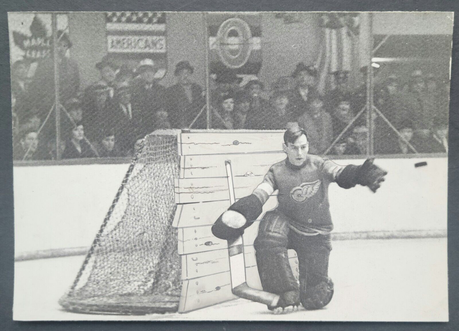 - Novelty shows Wing's goalie Wilf Cude with a boarded up net behind him