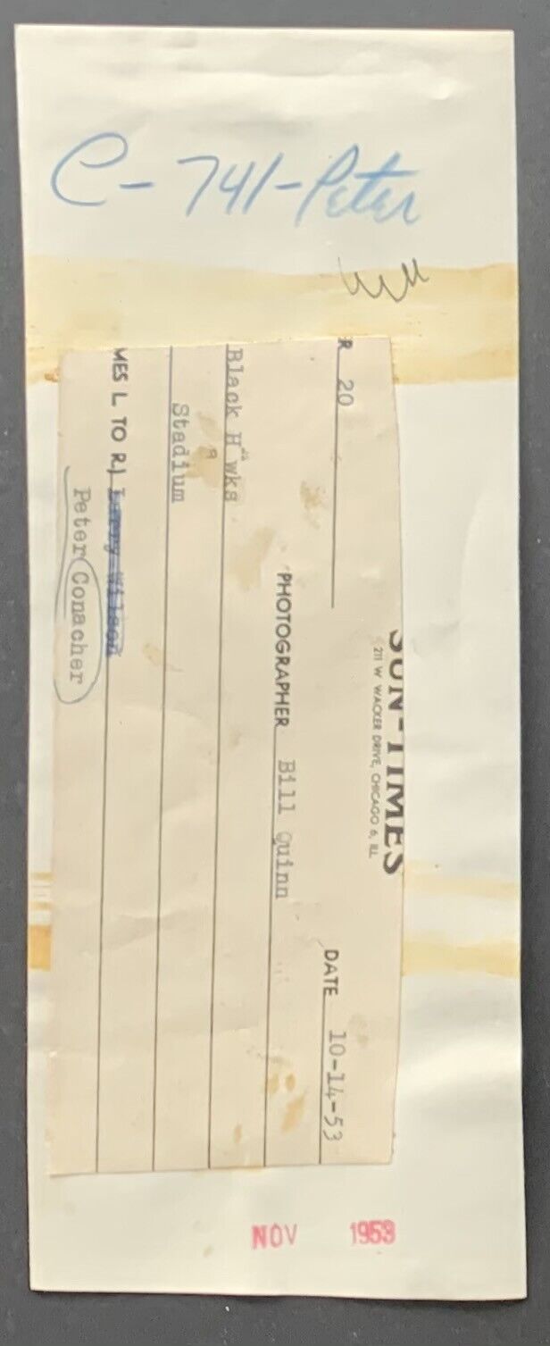 - 10-14-1953 Chicago Stadium NHL hockey type 1 press photo of Peter Conacher taken by photographer Bill Quinn