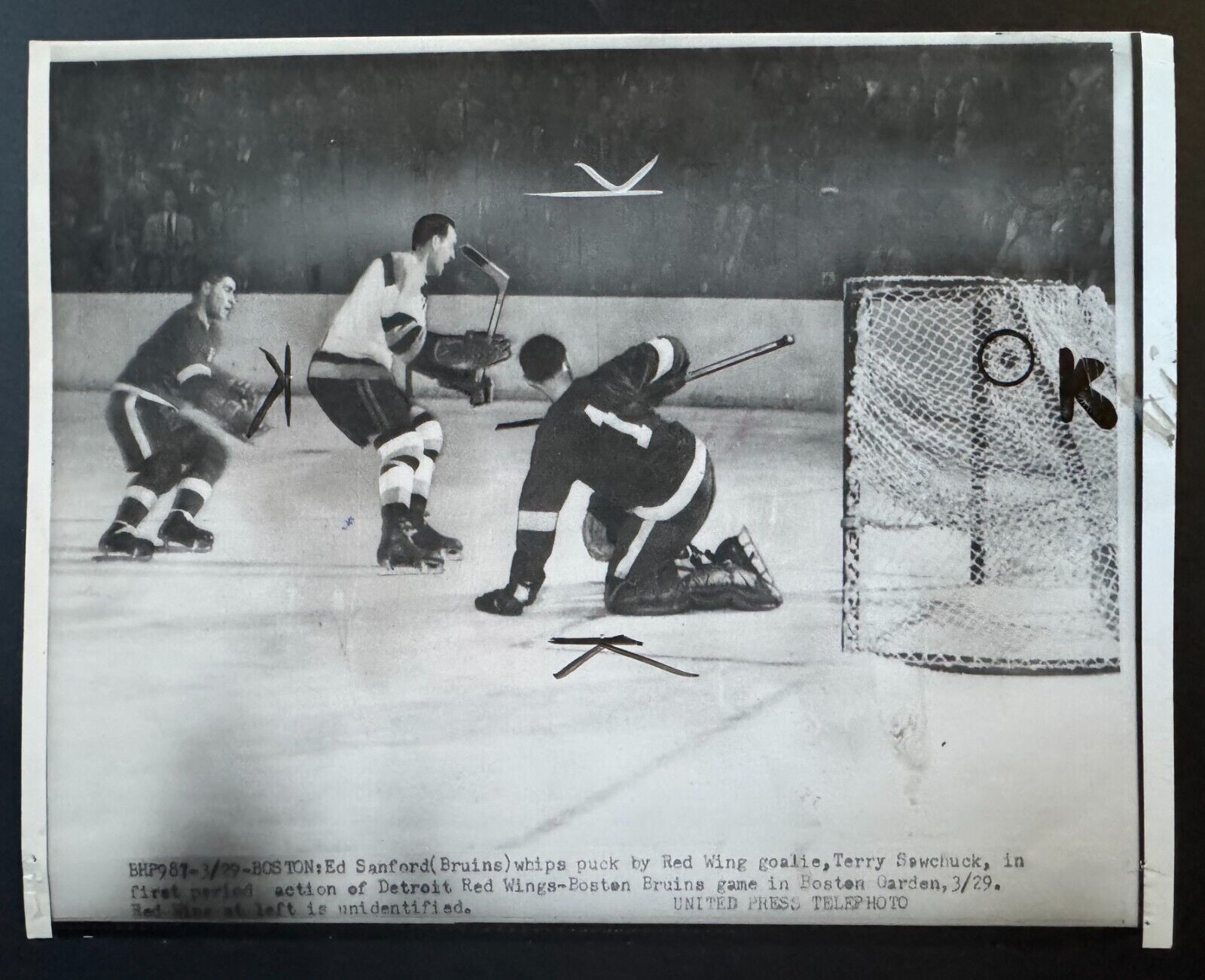 - Image shows Boston Bruins Ed Sanford scoring on Detroit Red Wings goalie Terry Sawchuk